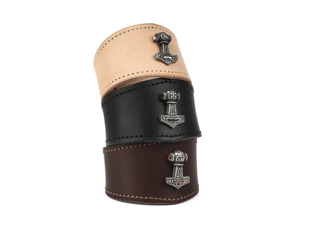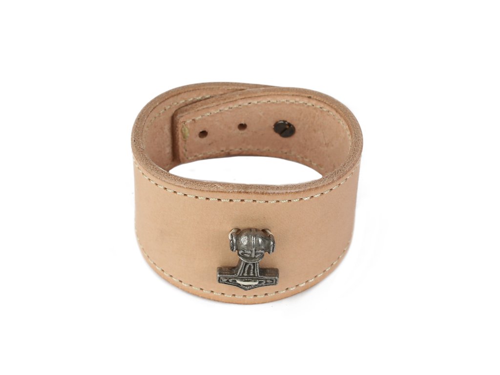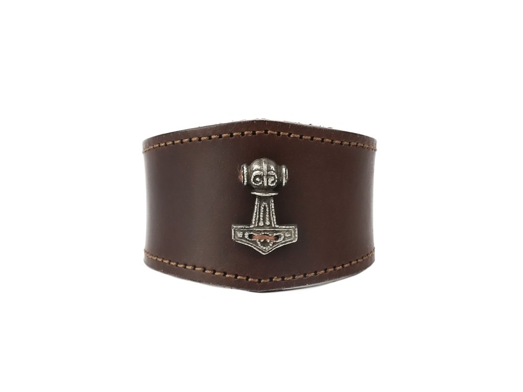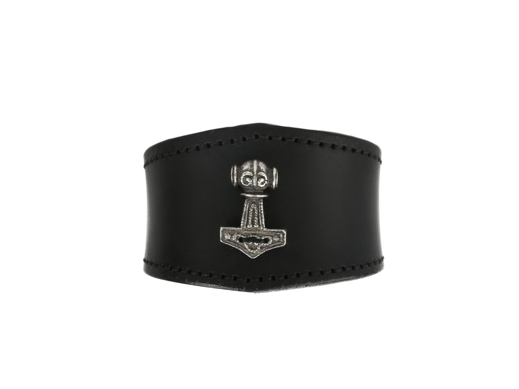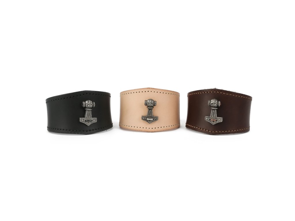 Kožený náramek s přišitým Thorovým kladivem. Má nastavitelnou velikost - kovový kolíček se dá přemístit do připravené dírky. Náramek tedy sedí na tři obvody zápěstí: 21 cm, 22,5 cm a 24 cm.