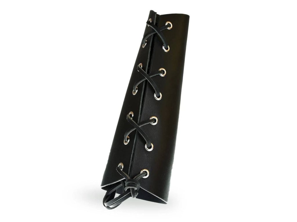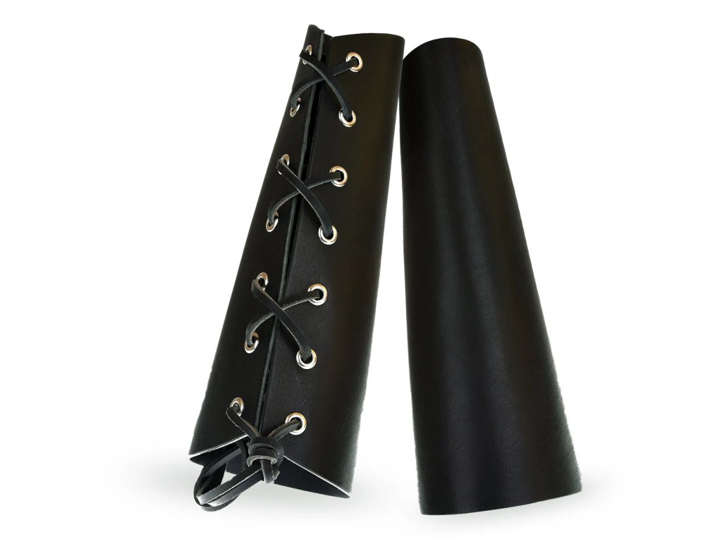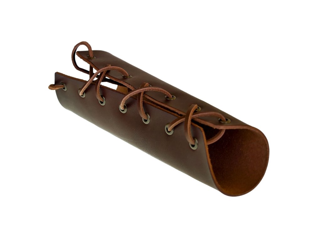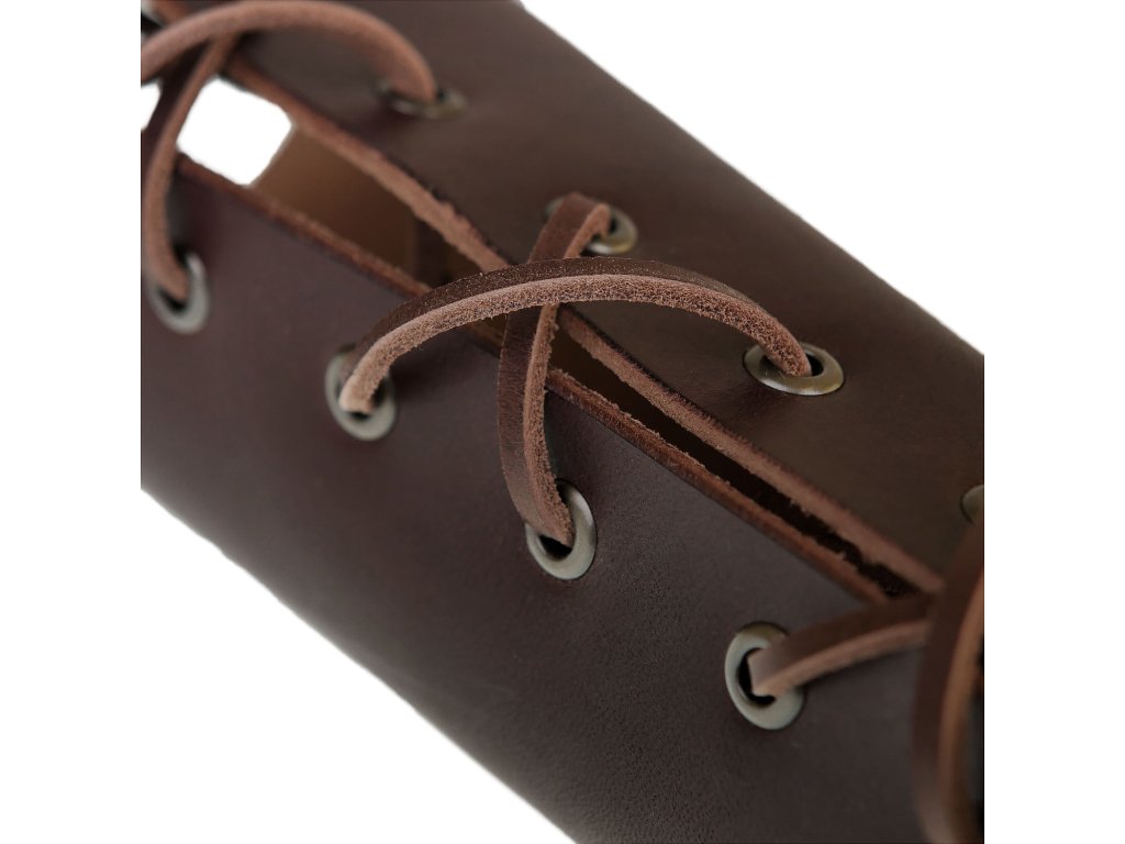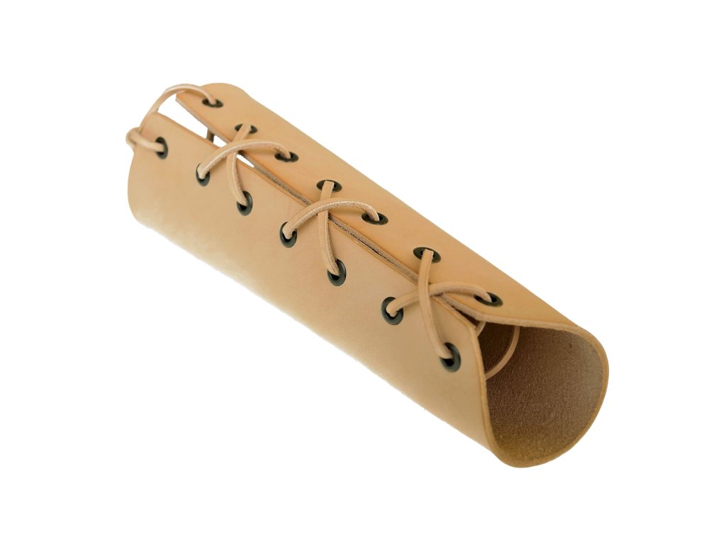 Nátepník je neodmyslitelná ochrana zápěstí všech bojovníků, lze jej zároveň užít jako doplněk ke kostýmu. Je vyroben z cca 2,5 mm silné kůže, zavazuje se koženou tkanicí. Tento prodloužený nátepník je opatřen kovovými průchodkami, takže se dírky neopotřebují častým zavazováním. V nabídce máme také variantu bez kovových průchodek. Nátepník je dlouhý 23 cm, kolem zápěstí má obvod 16,5 cm. Na přání lze zhotovit i jiný rozměr, namořit jinou barvou (např. modrou, červenou, žlutou...) nebo přidat zdobení nátepníku raznicí či motivem dle vašeho návrhu. Uvedená cena je za jeden nátepník.