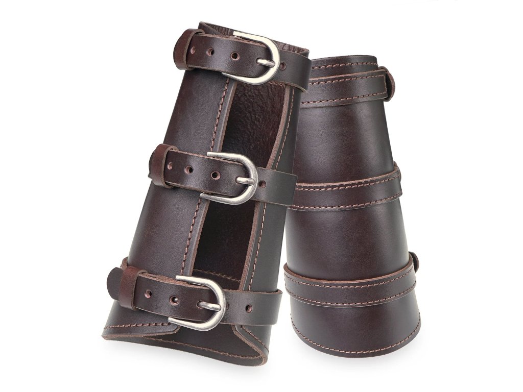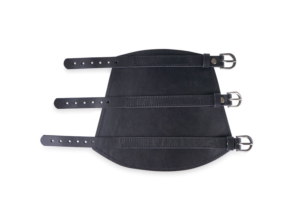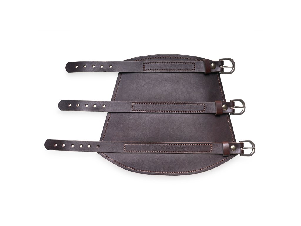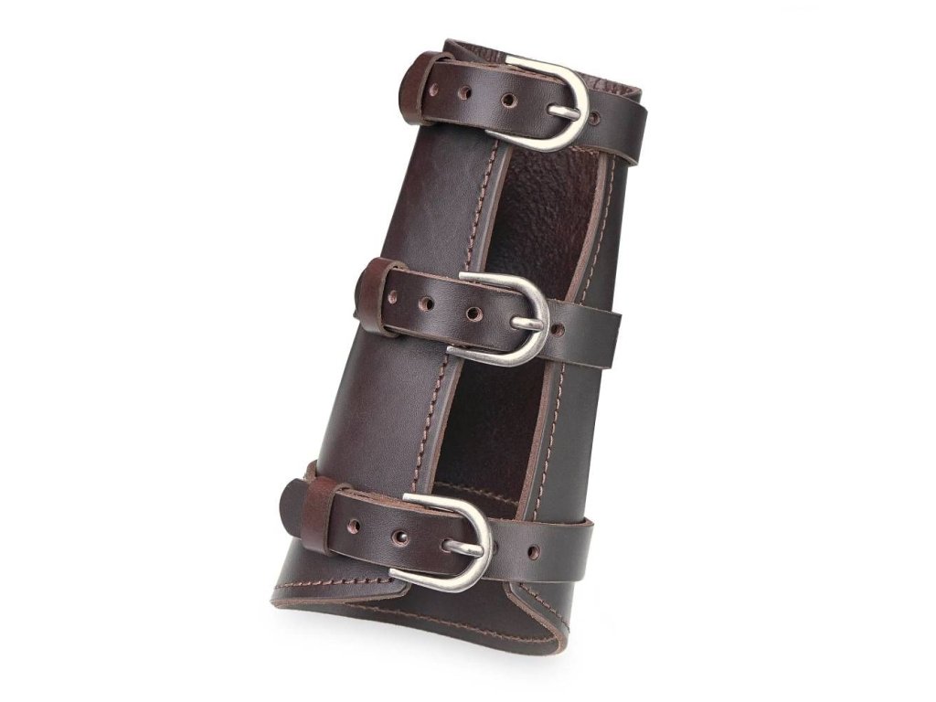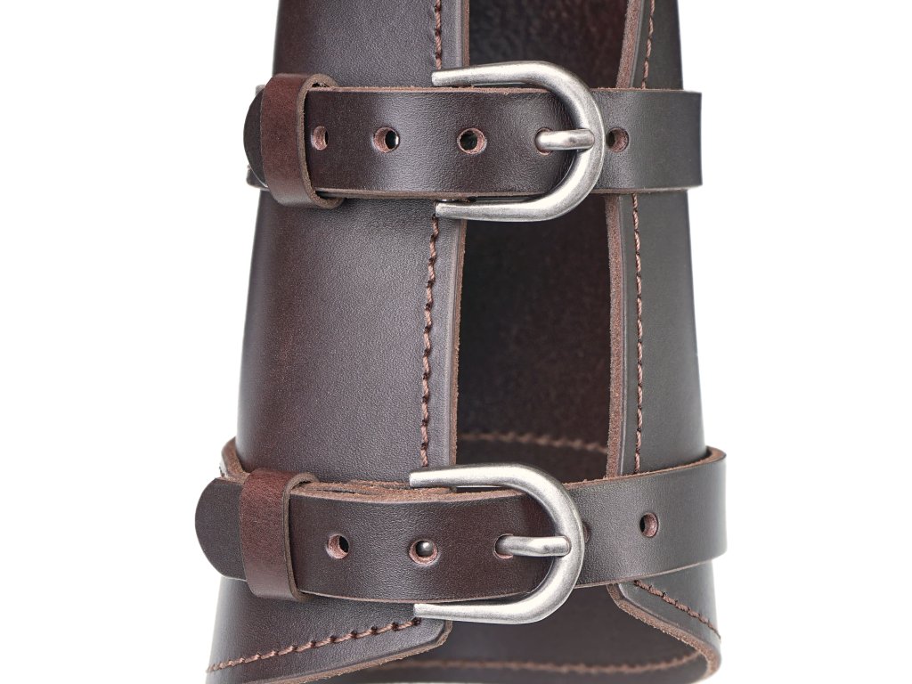 Kožený nátepník s prošívánými pásky s přezkami představuje neodmyslitelnou ochranu zápěstí nejen pro historický šerm, lukostřelbu, ale také jej hodně využívají nadšenci pro LARP. Kožený nátepník se zapíná pomocí přezek na tří páscích, které jsou po celém obvodu nátepníku. Bojovník se silnějším předloktím se nemusí obávat, nátepník se přizpůsobí opravdu každému. At už se boje zúčastníte aktivně s mečem či sekyrou v ruce, nebo pouze jako divák z koňského sedla či rozkládací židle, černý nebo hnědý kožený nátepník dokonale vyšperkuje váš dobový kostým. Obvod u zápěstí je nastavitelný v rozmezí 21, 5 - 27,5 cm a na vrchní straně 27 - 35 cm. Uvedená cena je za jeden nátepník.