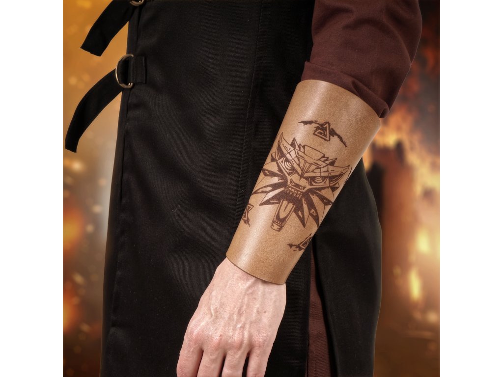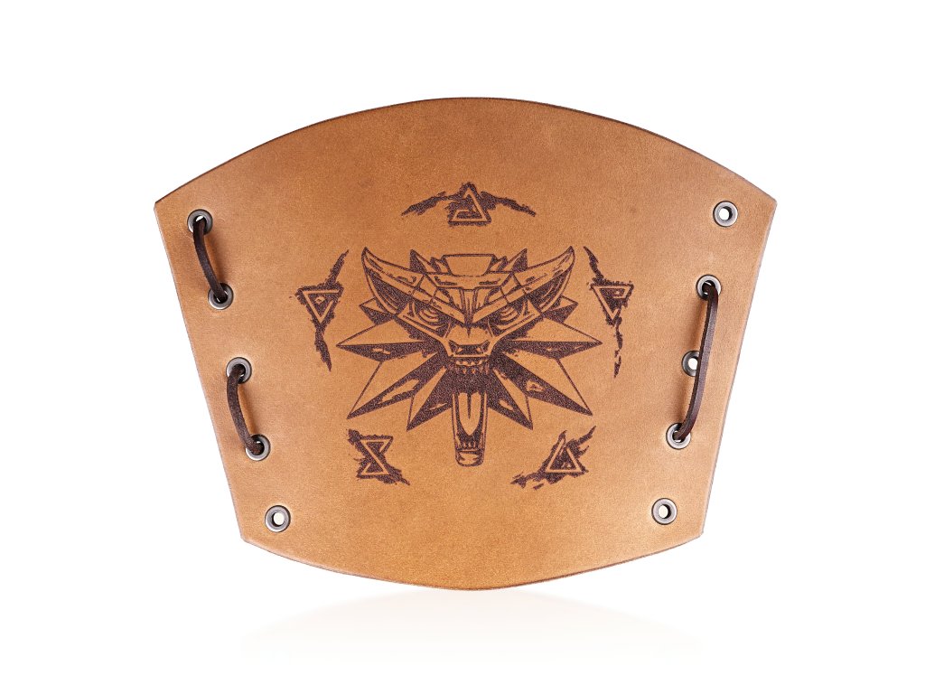 Kožený nátepník s motivem Zaklínačského medailonu - vlčí hlavy a magických run. Motiv je gravírovaný laserem a nátepník ručně dobarven. Délka nátepníku je 18 cm, obvod zápěstí 17 cm, tloušťka kůže cca 2,5 mm. Zavazuje se koženou tkanicí. Uvedená cena je za jeden nátepník.