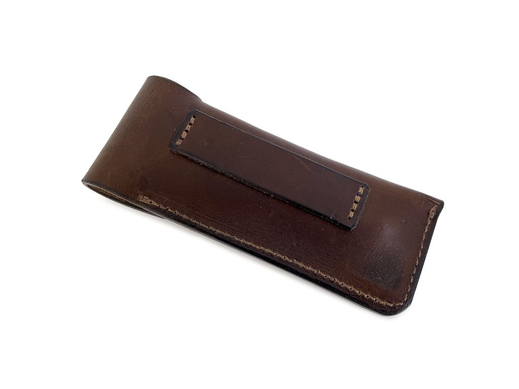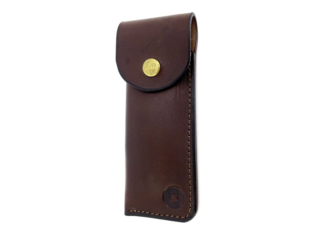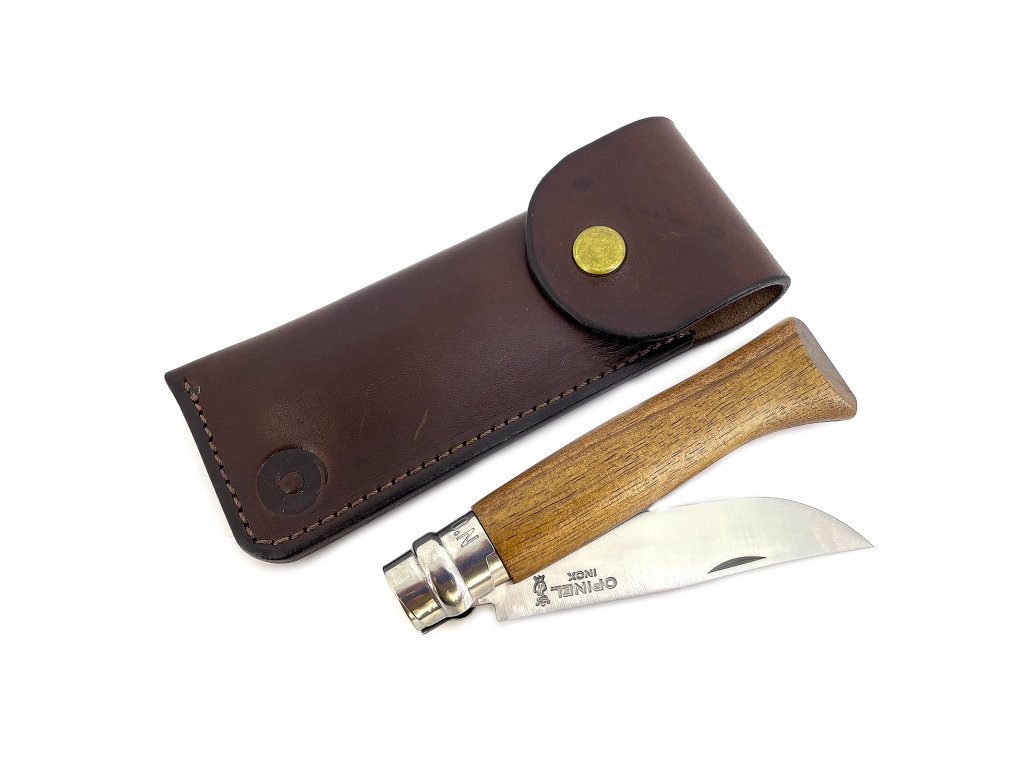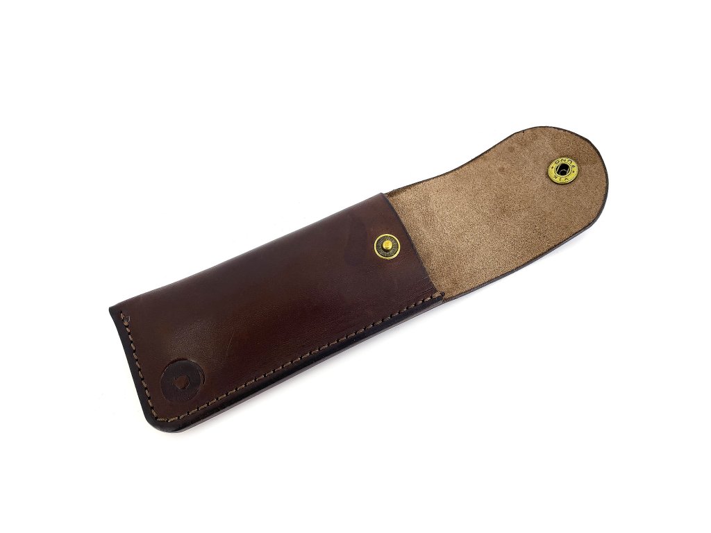 Elegantní kožené pouzdro na nůž, které jsme pro vás vyrobili v naší dílně. Můžete ho nosit na opasku a svůj nůž tak budete mít vždy po ruce. Obal jsme vyráběli na míru Opinelu No.08, ale snadno do něj schováte jakýkoliv zavírací nůž podobných rozměrů. Na výrobu pouzdra jsme použili prvotřídní hovězí kůži a zapíná se pomocí kovového cvočku. Díky koženému poutku ho můžete nosit na opasku, nebo připnout na batoh.