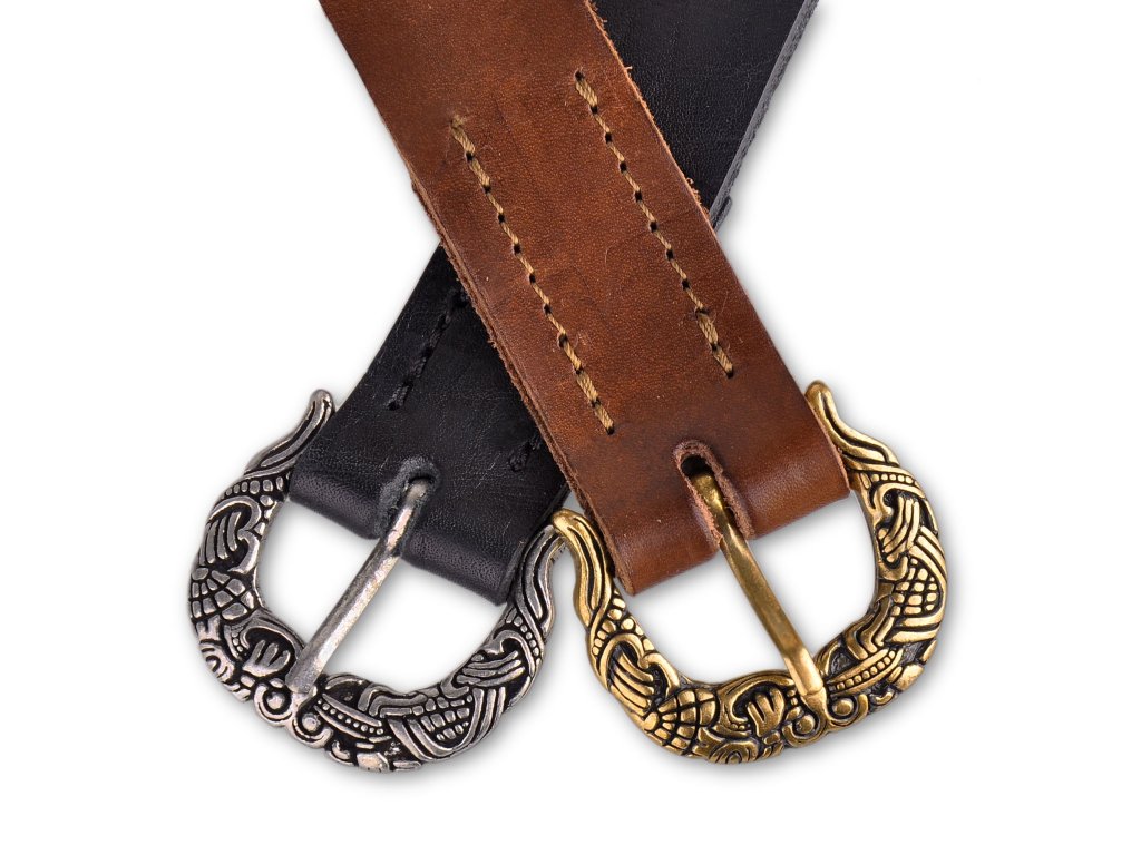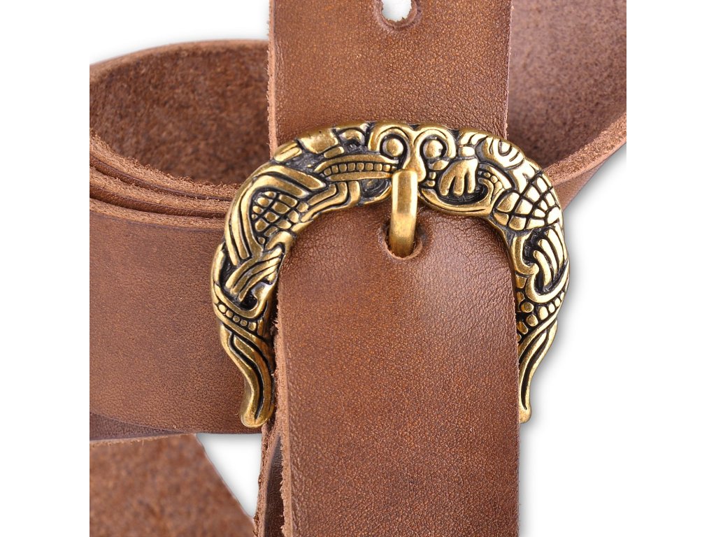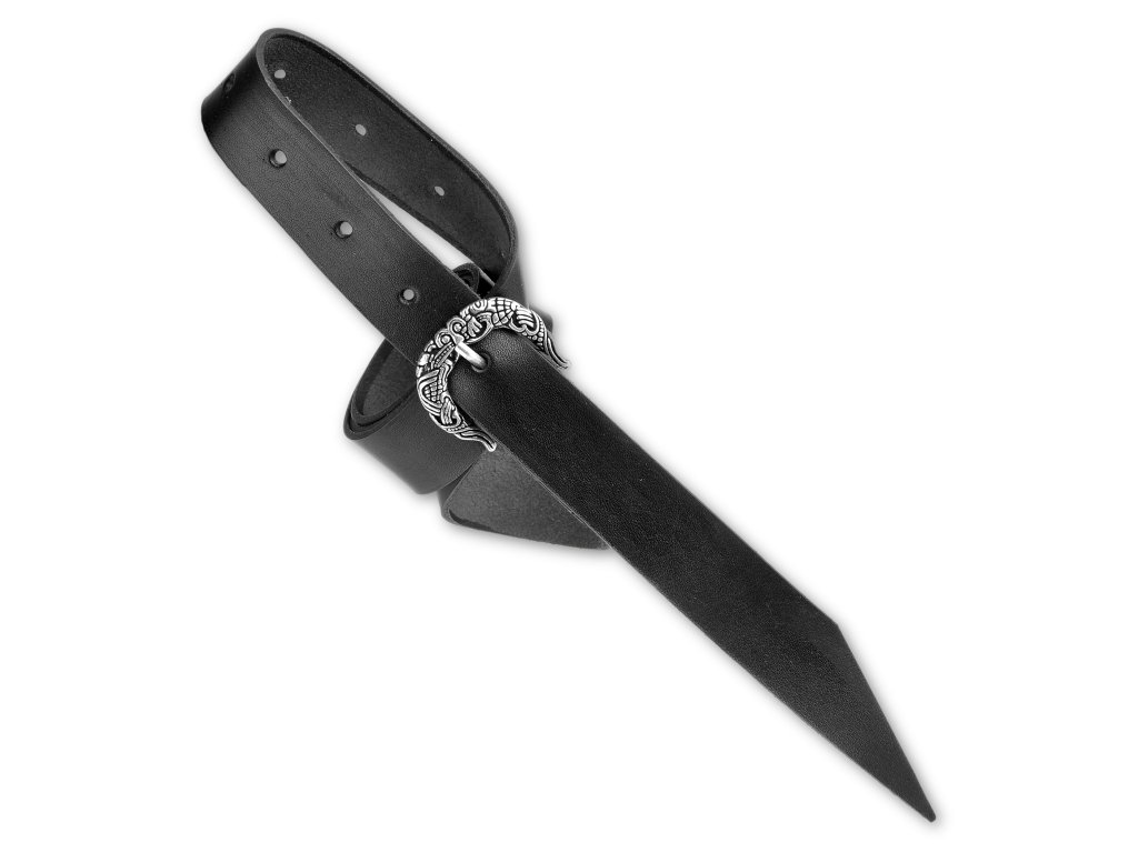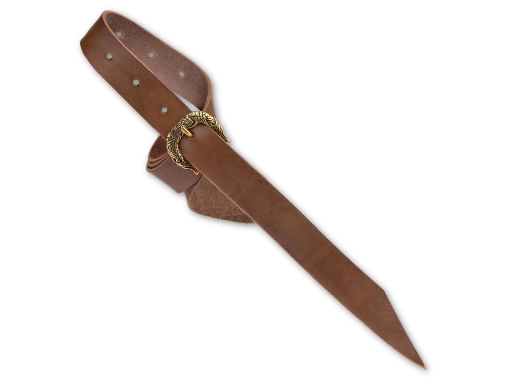 Stylový kožený opasek s kovovou přezkou zdobenou vikingskými motivy. Opasek má dírky v rozmezí obvodu pasu cca 90 - 110 cm. Tloušťka kůže je zhruba 3,5-4mm. Na přání můžeme vyrobit opasek dle požadovaných parametrů, například delší než 130 cm, jiná barva a pod. V případě zájmu nás neváhejte kontaktovat, nebo napište požadavek do poznámky k objednávce.