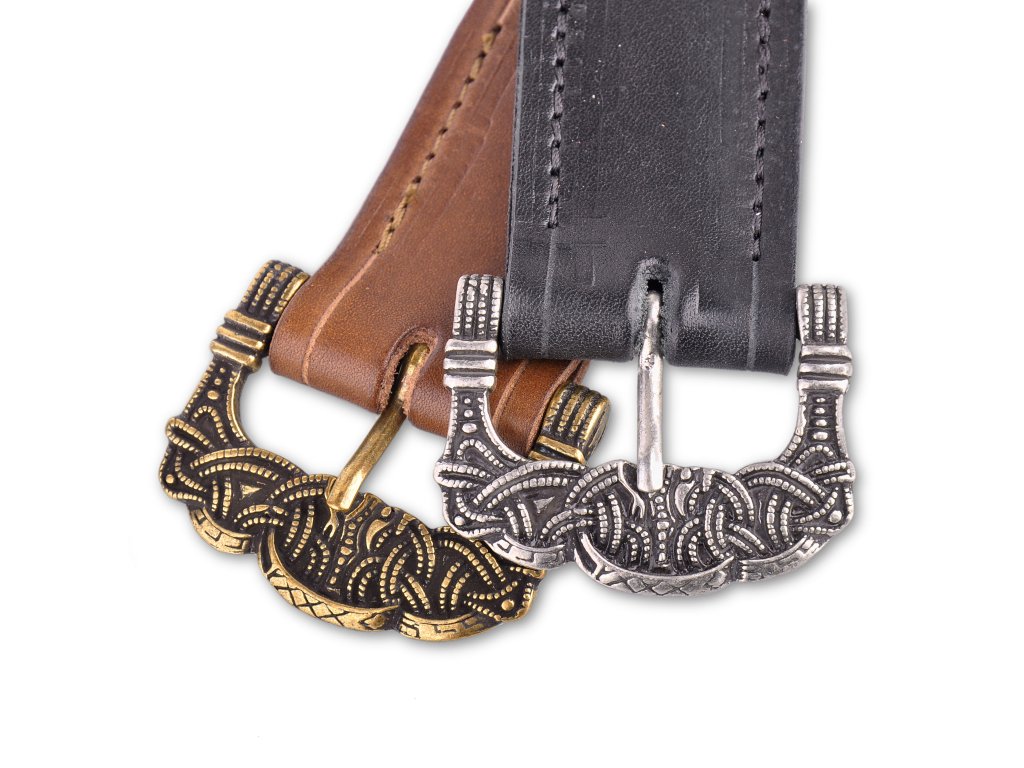 Kožený opasek s kovovou přezkou zdobenou severskými motivy. Opasek má dírky v rozmezí obvodu pasu cca 90 - 110 cm. Na přání můžeme vyrobit opasek dle požadovaných parametrů, například delší než 130 cm, jiná barva a pod. V případě zájmu nás neváhejte kontaktovat, nebo napište požadavek do poznámky k objednávce.