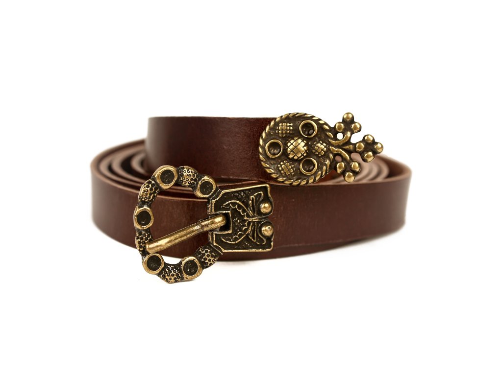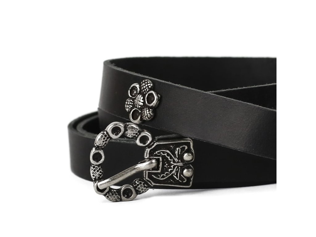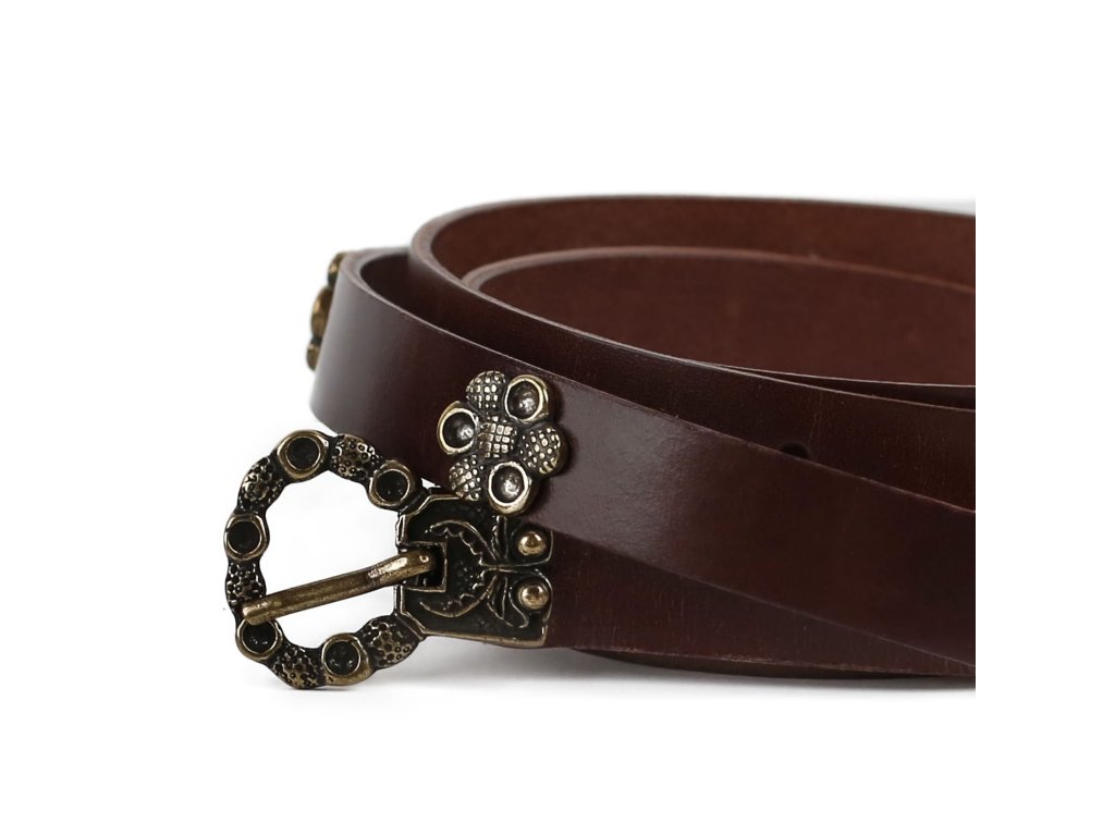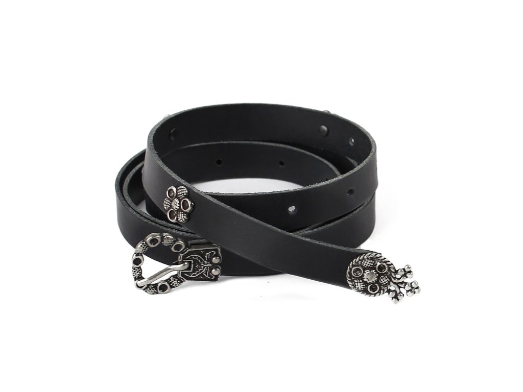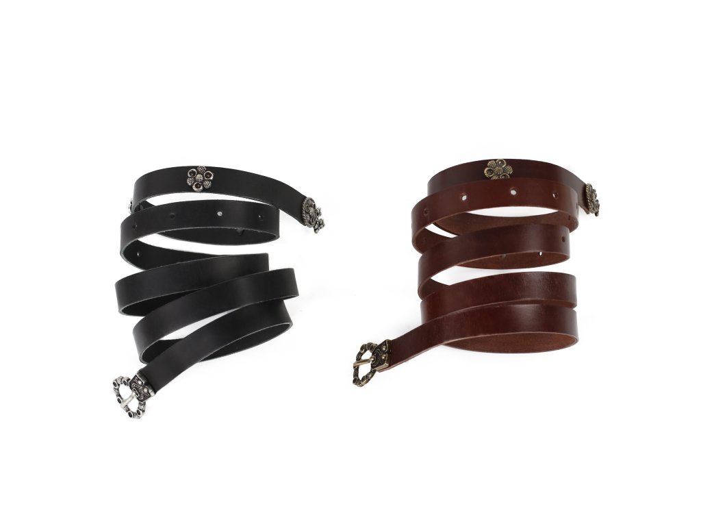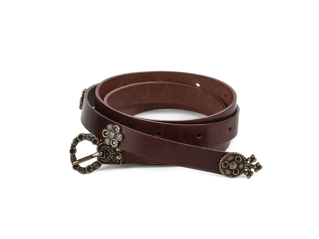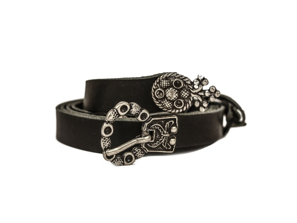 Urozené dámy, octly jste se ve středověku a máte domluvenou romantickou schůzku s Tristanem? Dobový kožený opasek s půvabným středověkým kováním bude tím pravým doplňkem ke středověkému kostýmu romanticky založených dam a dívek. Dámský kožený opasek z 2,5-3 mm silné kůže zdobí decentní kování středověkého vzhledu: zapínání na přezku, nákončí opasku a drobné kovové kvítky. K mání ve dvou variantách: černá s kováním stříbrné barvy a hnědá s kováním bronzové barvy. Opasek má dírky v rozmezí obvodu pasu cca 74 - 110 cm. Šířka opasku je 1,7cm. Bude ideálním koženým doplňkem ke středověkému dámskému kostýmu, ale hodí se též skvěle k jiným dámským fantasy kostýmům. Na přání můžeme vyrobit opasek dle požadovaných parametrů, například delší než 140 cm, jiná barva a pod. V případě zájmu nás neváhejte kontaktovat, nebo napište požadavek do poznámky k objednávce.