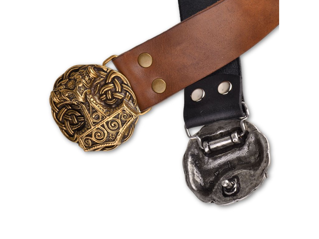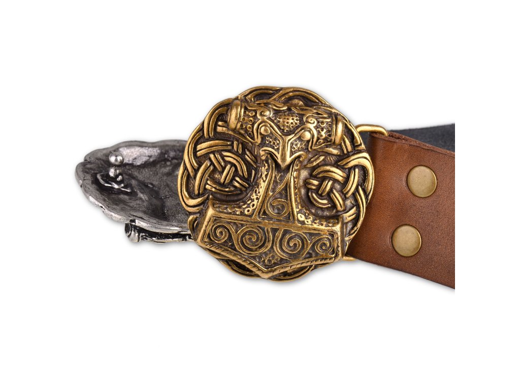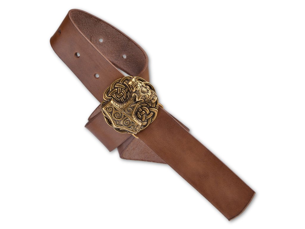 Kožený opasek s masivní kovovou přezkou s trnovým zapínáním. Na přezce o průměru cca 6 cm je zpodobněno kladivo Mjölnir - bájná zbraň severského boha Thóra. Opasek má dírky v rozmezí obvodu pasu cca 90 - 110 cm. Na přání můžeme vyrobit opasek dle požadovaných parametrů, například delší než 130 cm, jiná barva a pod. V případě zájmu nás neváhejte kontaktovat, nebo napište požadavek do poznámky k objednávce.