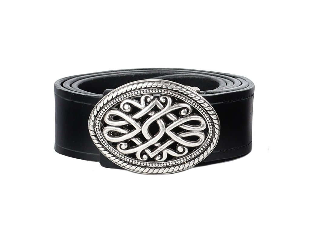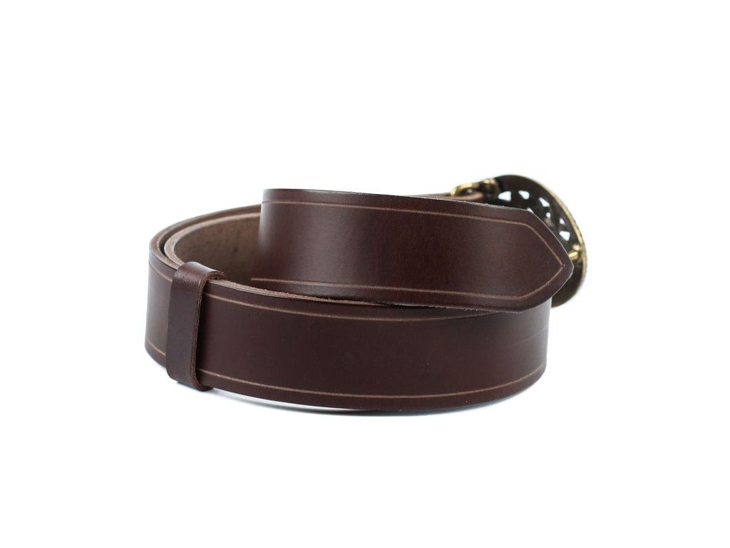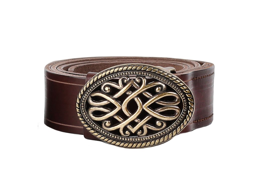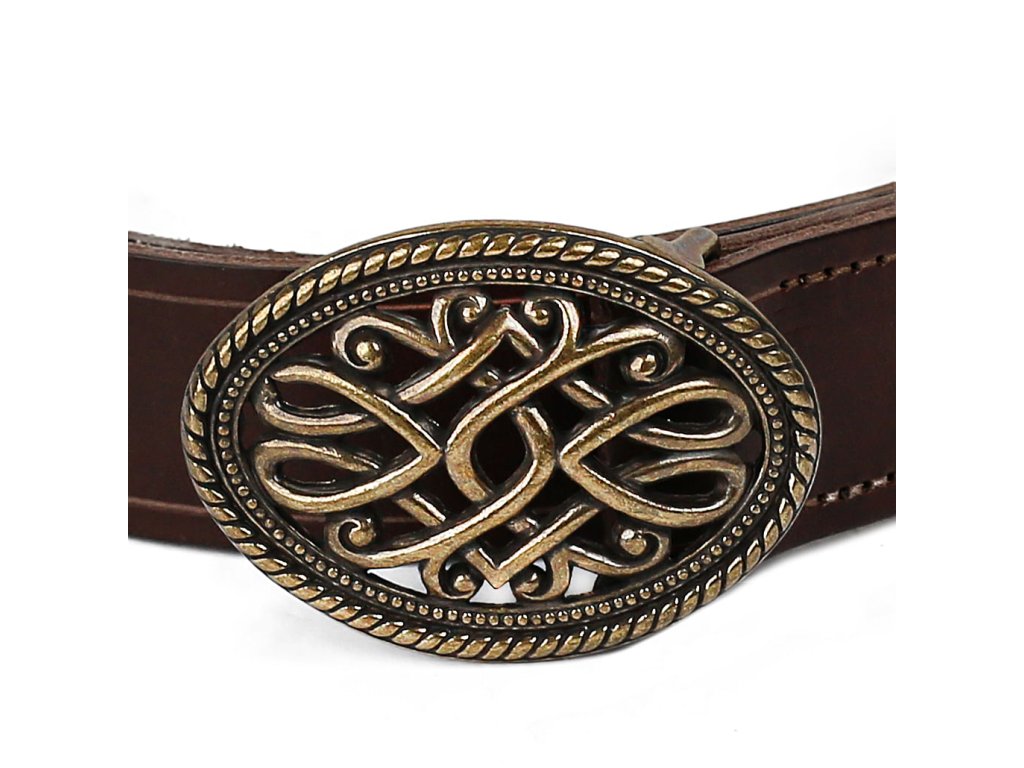 Dámský opasek nese jméno Sigur, jenž znamená vítězství, po kterém tak často toužíme, když vyrážíme na dřevárně do bitevní vřavy. Kvalitní kožený opasek zdobí masivní kovová spona s proplétaným fantasy motivem a jednoduché ryté čáry lemují opasek po jeho okrajích. Opasek má trnové zapínání a dírky v rozmezí obvodu pasu cca 67 - 91 cm. Je zhotoven ve dvou variantách: z hnědé kůže se sponou v odstínu staromosazi a z černé kůže se stříbrně zbarvenou sponou. Opasek Sigur bude skvělým doplňkem k pánským kostýmům z naší dílny. Hodí se ke kalhotům i jako ozdobný opasek na svrchní tuniku. Na přání můžeme vyrobit opasek dle požadovaných parametrů, například delší než 110 cm, jiná barva a pod. V případě zájmu nás neváhejte kontaktovat, nebo napište požadavek do poznámky k objednávce.