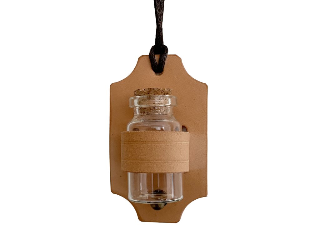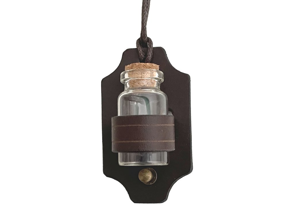 Ať už jsi alchymista, čaroděj, léčitelka nebo temný žoldák, bez své věrné lahvičky nevyrazíš do světa. Tento ručně vyrobený kožený závěs s malou skleněnou lahvičkou je perfektní doplněk ke každému fantasy nebo historickému kostýmu. Lahvičku zavěšenou na kožené šňůrce si můžeš nosit na krku, nebo na opasku. A co do ní dáš? Elixír života, jed na čepel, dračí krev… Fantazii se meze nekladou! Závěs o rozměru 7 x 4 cm je vyroben z kvalitní hovězí kůže u nás v imago dílně – ručně barvený a šitý. Skleněnou lahvičku o velikosti 4 cm s korkem drží pevně a bezpečně! Na výběr máš ze 3 barev: přírodní, černá a hnědá.
