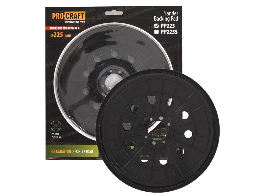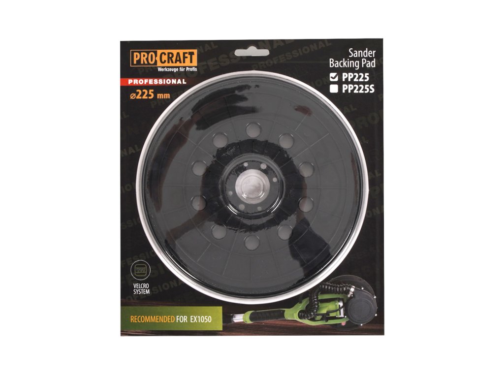 Kulatý unášecí talír Procraft PP225 s suchým zipem pro brusky na sádrokarton, průměr 225 mm. Vybaven otvory pro odsávání, vhodný pro nářadí EX1050.