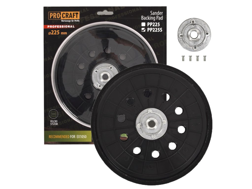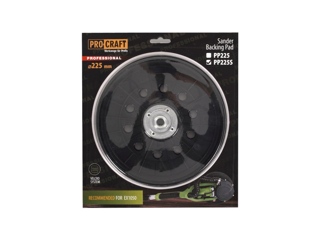 Kulatý unášecí talír Procraft PP225S pro brusky na sádrokarton, průměr 225 mm, se suchým zipem a závitem M14. Otvory pro odsávání zlepšují práci, vhodný pro EX1050.