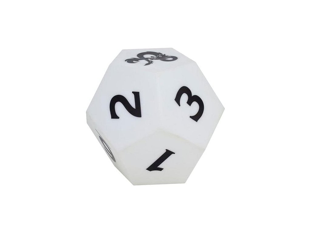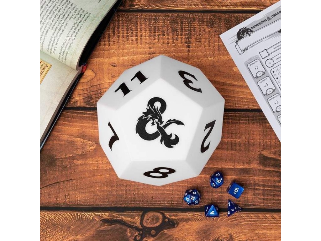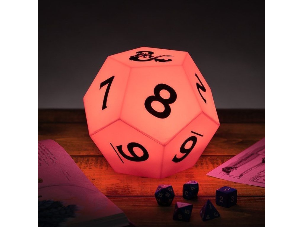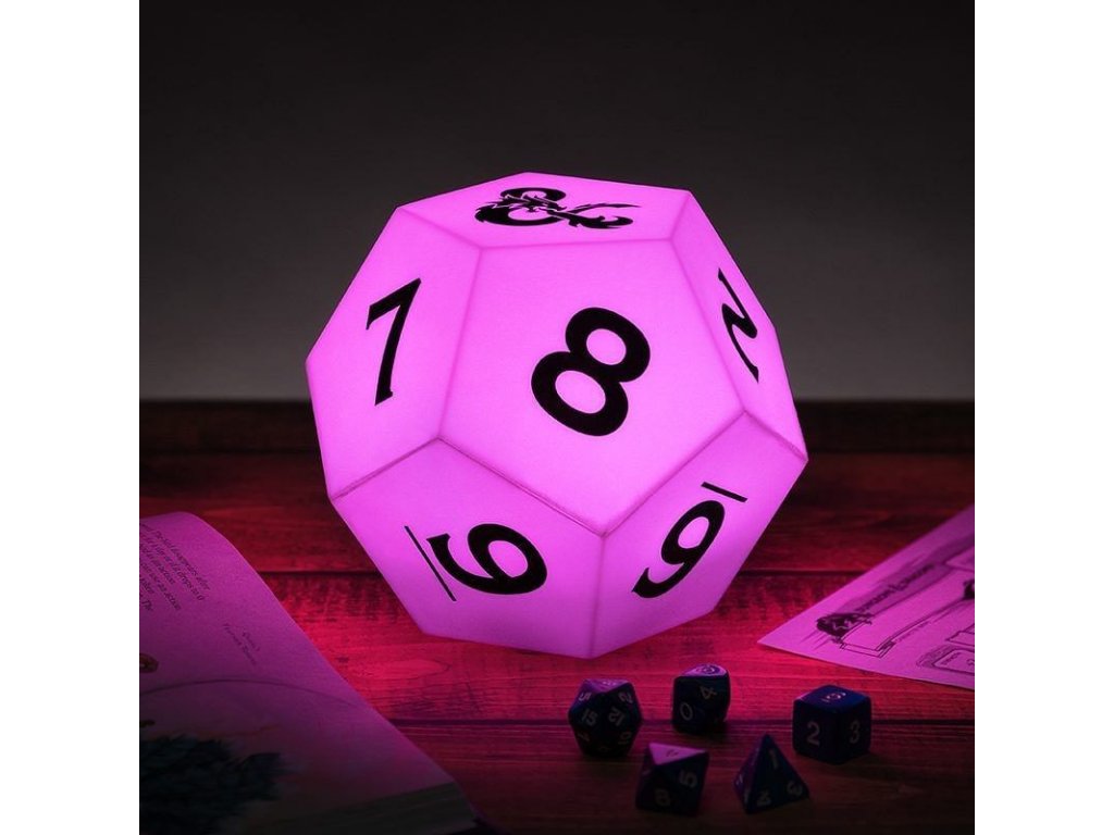 Lampa v podobě kostky D12 pro světově oblíbenou hru na hrdiny Dungeons and Dragons se hodí nejen pro vaše herní seance! Lampa mění barvy mezi fialovou, modrou, zelenou, žlutou a červenou. Užijte si při svých dobrodružstvích tu správnou magickou atmosféru. Skvělý dárek pro hráče RPG a správné geeky! Napájeno za pomoci 2 ks baterií AAA (nejsou součástí balení). Lampičku tak můžete umístit, kam se vám zlíbí, a snadno si ji vezmete s sebou, ať už máte herní session kdekoli.