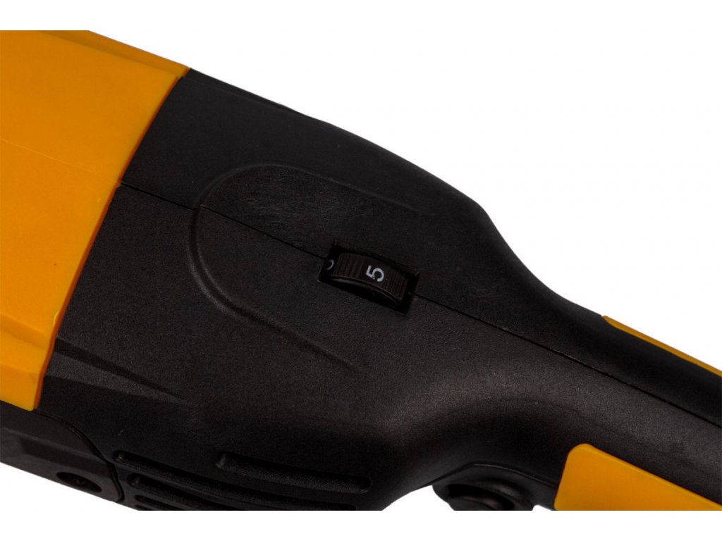 Rukojeť je osazena spouští s regulací otáček a aretací pro stálý chod. Snadno si tak upravíte rychlost otáček během práce. Nastavit můžete až 6 stupňů rychlostí v rozmezí 600 až 3200 ot./min.