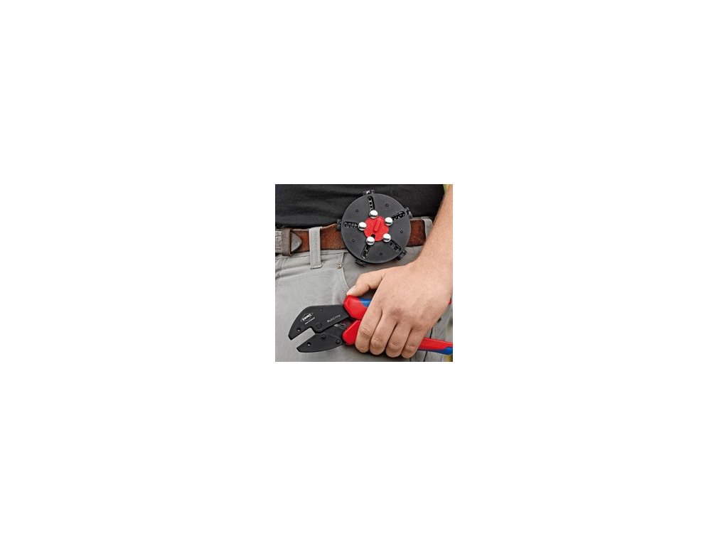 Pouze jeden nástroj pro běžné krimpování. Rychlá a snadná výměna krimpovacích nástavců bez nutnosti dalšího nářadí. Bezpečná úschova výměnných nástavců v kruhovém zásobníku. Komfortní, výkonné krimpovací kleště v profesionální kvalitě.. Spolehlivé krimpování jako u pevně namontovaných krimpovacích nástavců. Konstantně vysoká kvalita lisování díky precizním profilům a nuceným blokováním (možné odblokovat). Chromvanadová elektroocel ve zvláštní jakosti, kalená v oleji. Kruhový zásobník: plast, vyztužen optickými vlákny.