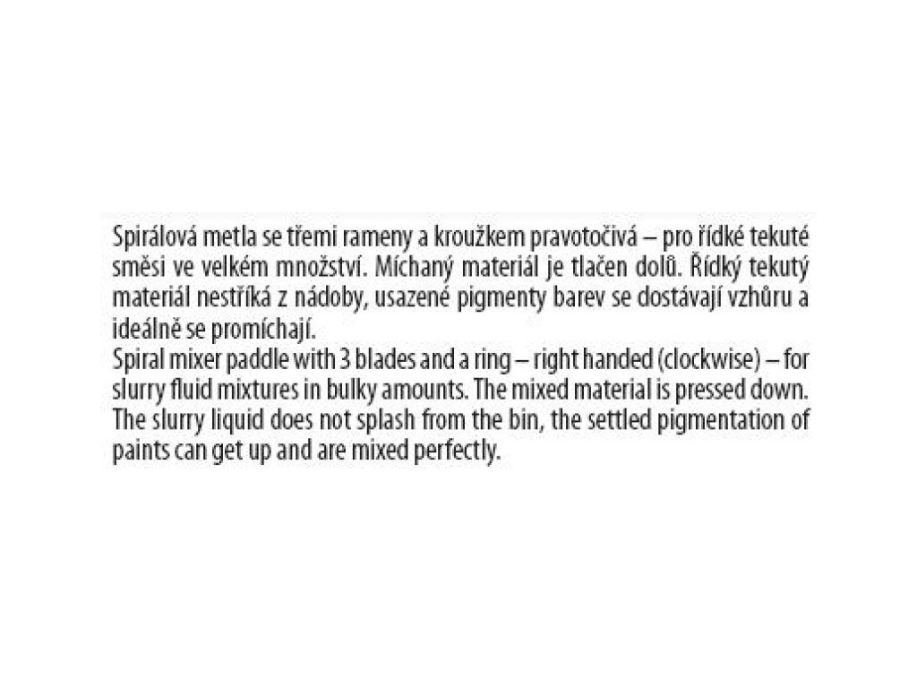 Míchadlo - levotočivé (míchací účinek shora tlačí směs dolů) - metla, pozinkované, rozměr : 120 x 600 mm - M14, použití : pro těžké materiály s vysokou viskozitou. Malty, betony, cementové a vápenné omítky, spojovací hmoty, mazaniny, epoxidové pryskyřice, živičné vrstvy.