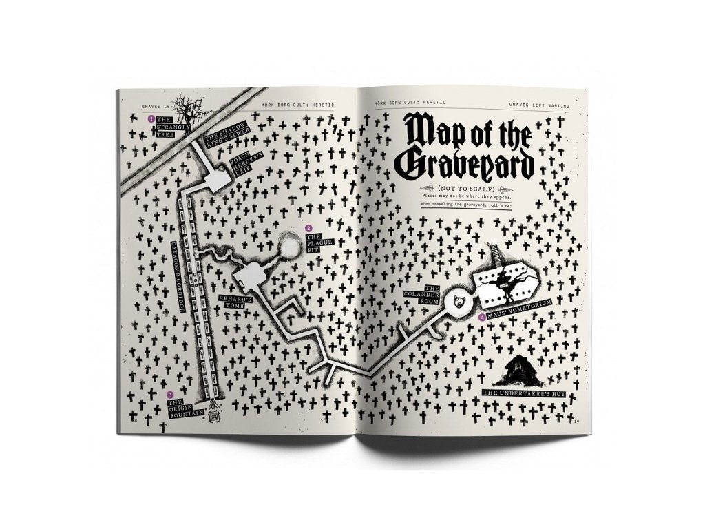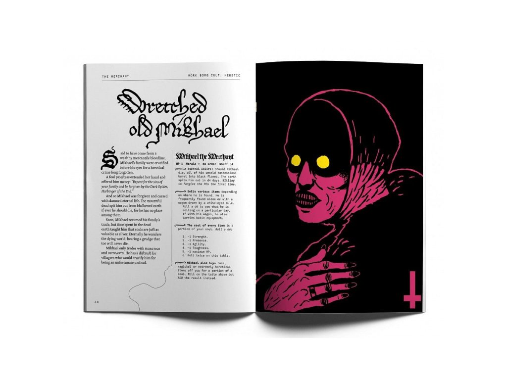 Příručka MÖRK BORG CULT: Heretic obsahuje doplňky a dobrodružství pro cenami ověnčené metalové fantasy RPG MÖRK BORG. Kniha je v anglickém jazyce. MORK BORG Cult: Heretic is a zine of community-made misadventure and malice, for use with MORK BORG or other rules-light dark fantasy games. Unheroic Feats. Enhance and personalize your classless characters with these optional advancement rules. Bloat. Villagers disappear. Tracks lead to an underground temple of bacchanalian frenzy, reeking of rot, offal and bile. A two-page dungeon for the peckish. Two additional, optional classes: The bastard of a bard Sacrilegious Songbird and the Shedding Vicar, a fanatic preaching the skinless gospel.