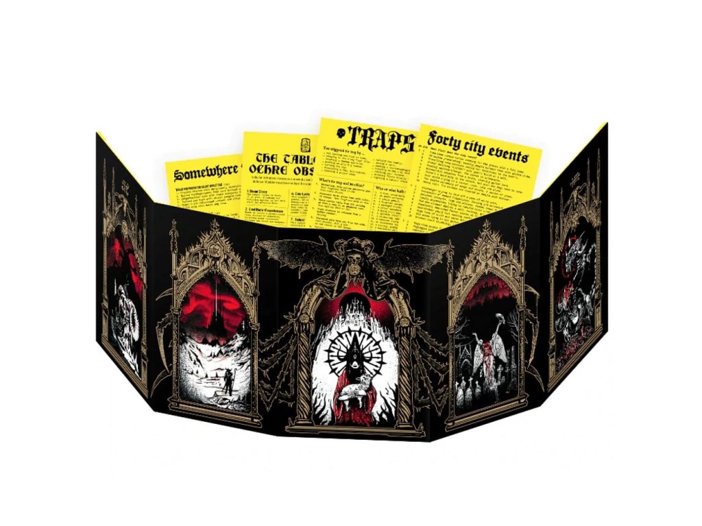 MÖRK BORG GM Screen je zástěna pro metalové fantasy RPG MÖRK BORG, která usnadní práci gamemasterovi. Zástěnu tvoří pět složených panelů, uvnitř se nachází užitečné tabulky a pravidla, z vnějšku pak obrázky lokací a důležitých postav. Zástěna je v angličtině. MORK BORG GM Screen: A five-paneled portrait wall of death. Printed with gold metallic ink on one side and vivid neon yellow on the other. The front is all art, five scenes of various locales and important characters in the Dying world. The GM-facing side sports a wide array of tables and rules summaries that might come in handy during play.