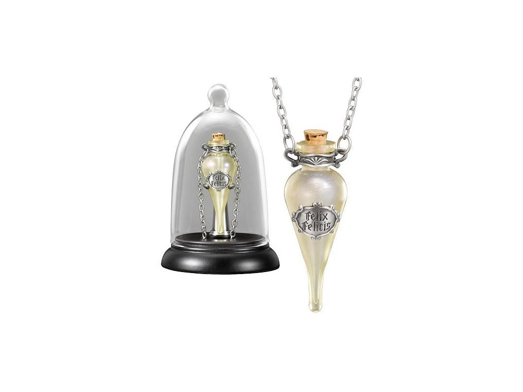 Náhrdelník stylizovaný do podoby lektvaru štěstí - Felix Felicis dle předlohy z filmu Harry Potter. Lahvička je skleněná, má šroubovací uzávěr. Součástí je stojánek se skleněným poklopem a řetízek dlouhý cca 45 cm.