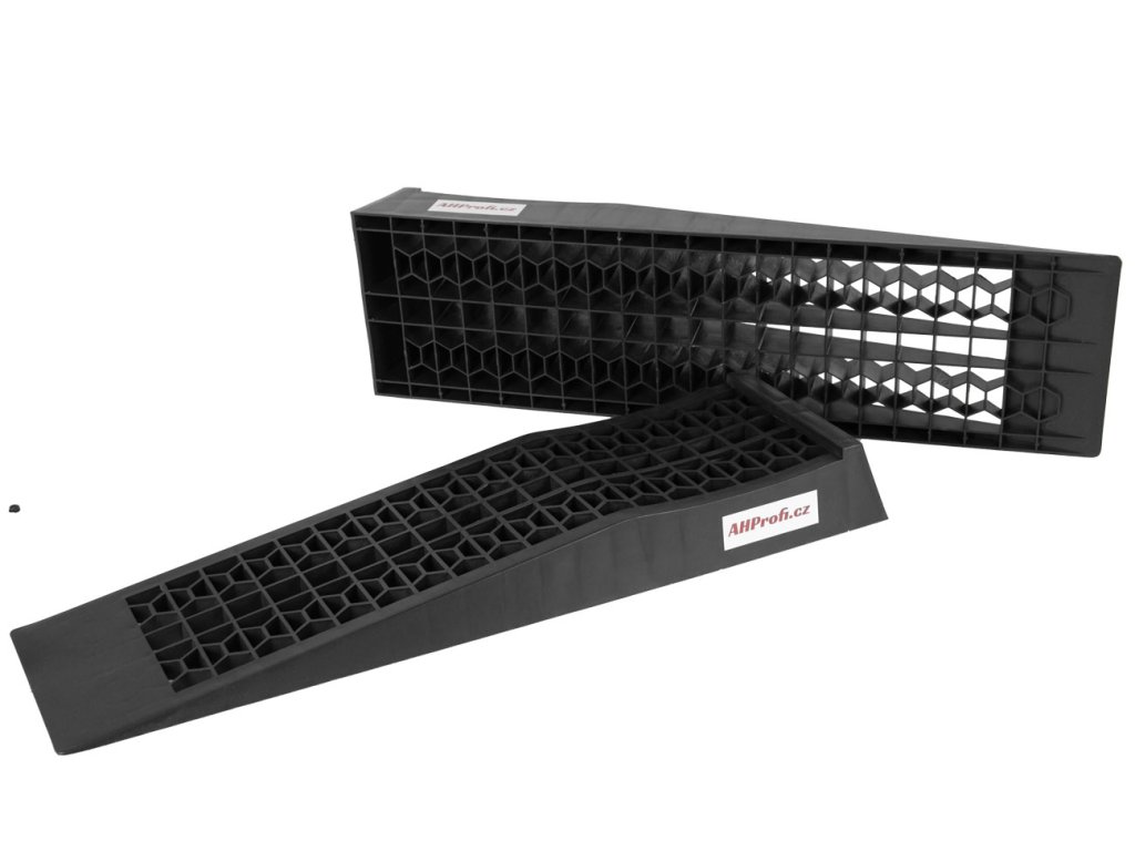 Nájezdová rampa pro vozy s nízkým profilem 700 x 200 x 80 mm. Nájezdy na auto o nosnosti 2 tuny/pár. Po najetí na nájezdy pod auto jsou kola ve výšce 70 mm.