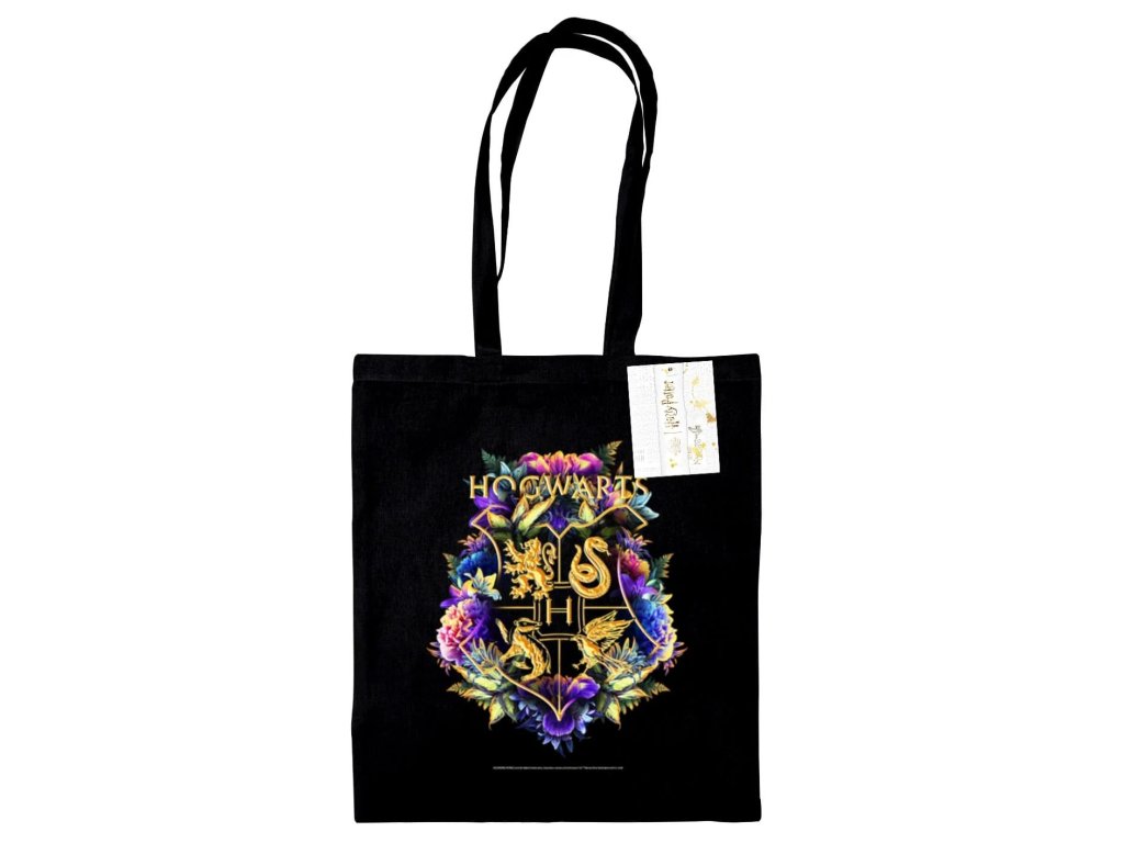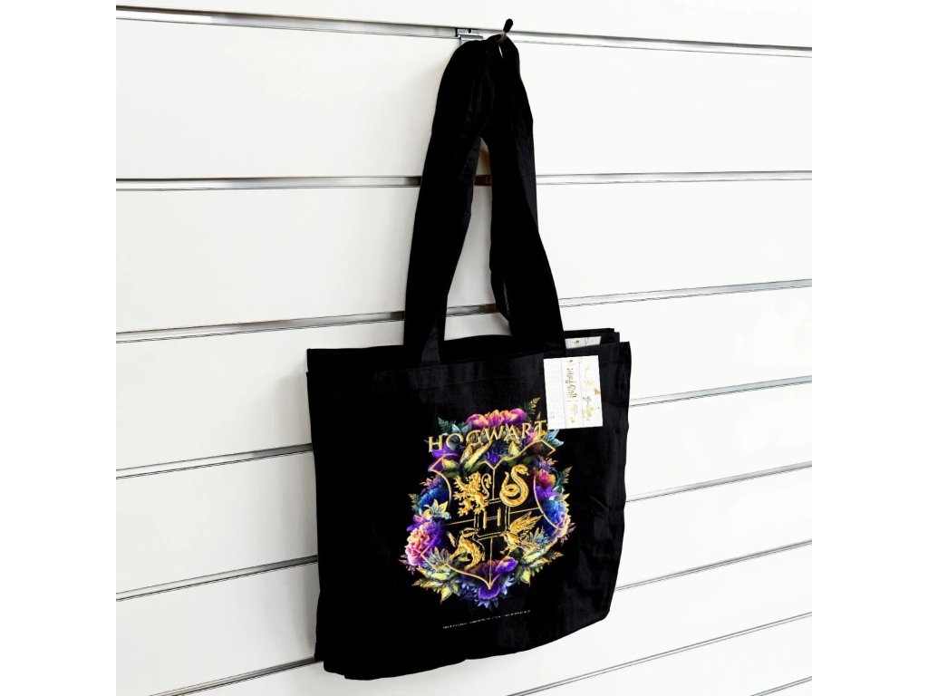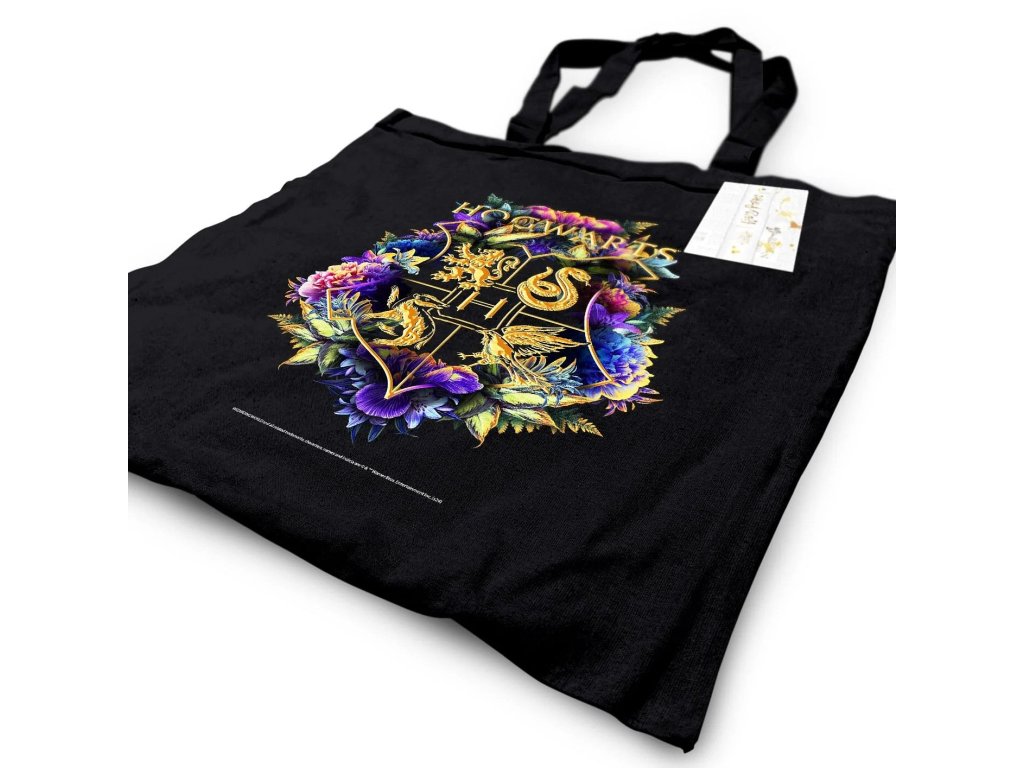 Nakupuj s potterovskou taškou, kterou zdobí barevný erb školy čar a kouzel! Stylová černá taška pro studenty z Bradavic a milovníky Harryho Pottera. deální do školy, práce i na procházky, tato taška ti přinese kousek magie do každodenního života.