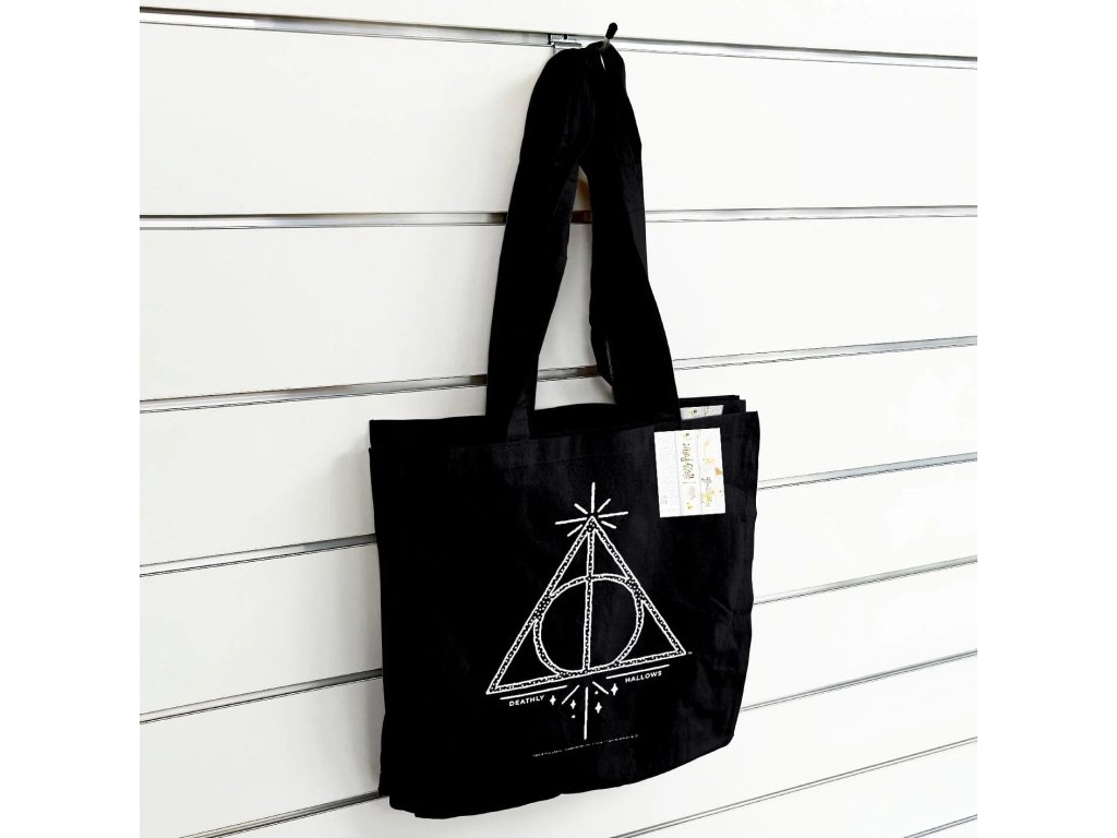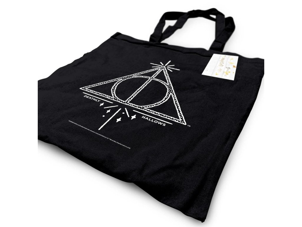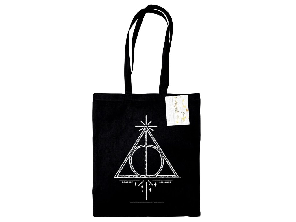 Zmocni se tašky od samotné prohnané Smrti! Bezová hůlka. Kámen vzkříšení. Neviditelný plášť. Černá nákupní taška se symbolem Relikvie smrti ti bude spolehlivým společníkem na cestách do školy i do práce. Taška z kvalitního materiálu se ti hodí pro mudlovský nákup i na setkání potterheadů a nadšenců Harryho Pottera, jako jsou festivaly a cony.