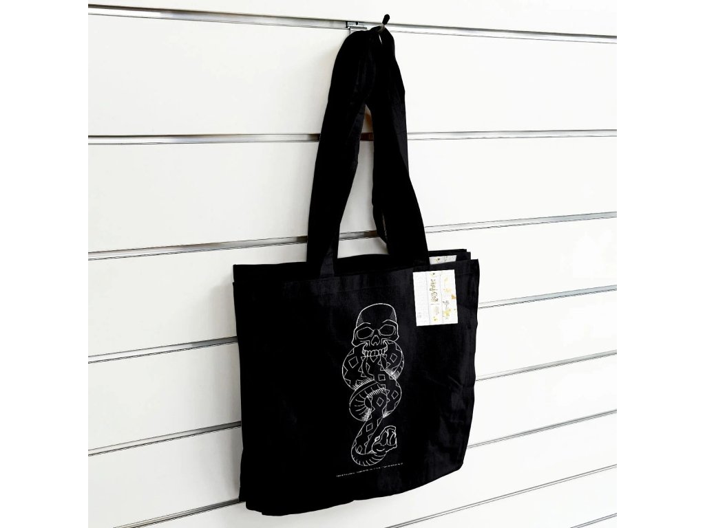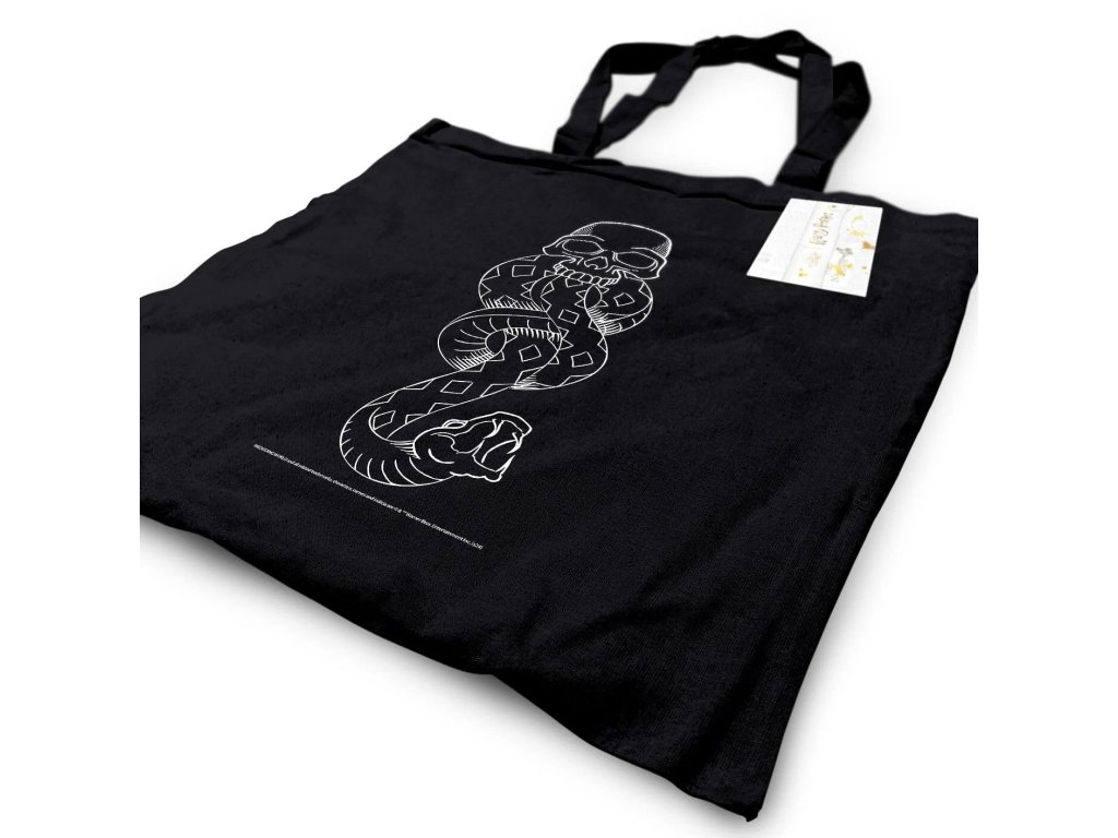 Černá nákupní taška se znamením zla, které nosili Smrtijedi, věrní služebníci lorda Voldemorta z Harryho Pottera. Ať už míříš na procházku do města nebo cestuješ vlakem či létajícím autem do Bradavic, v pěkné tašce z kvalitního materiálu najdeš dostatek místa pro svačinu, knihy i nákup.