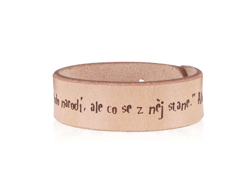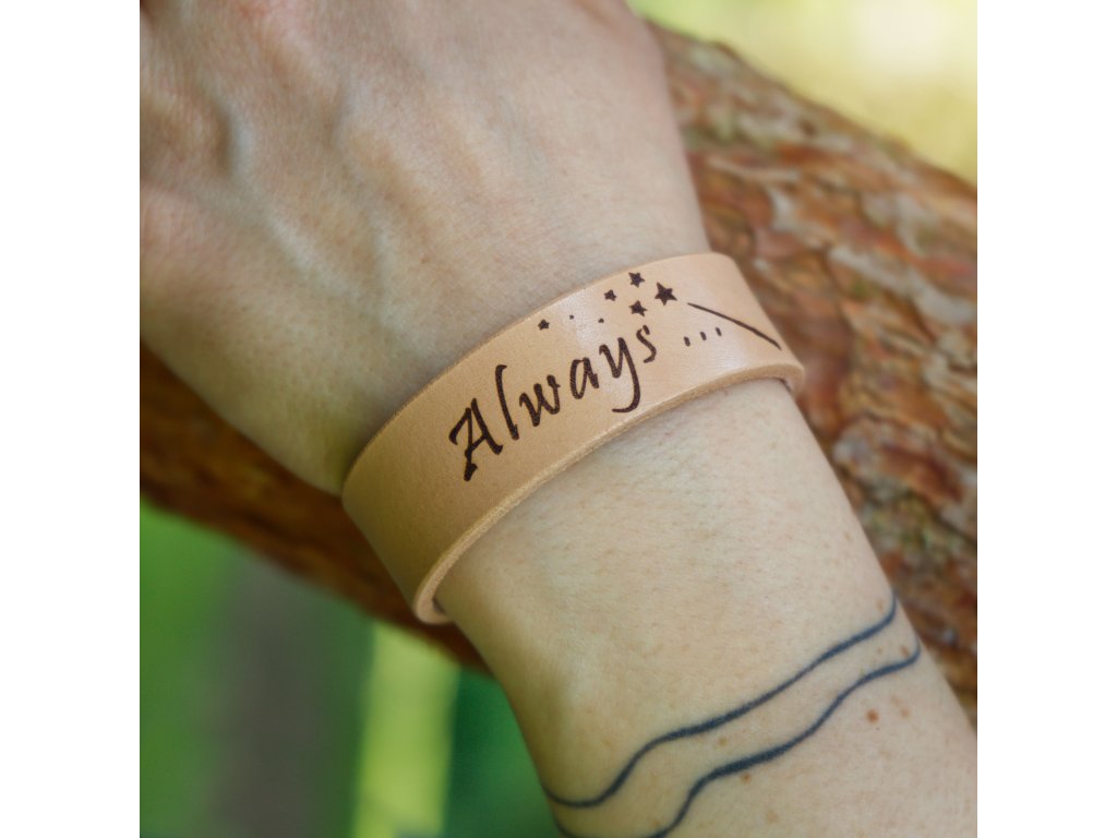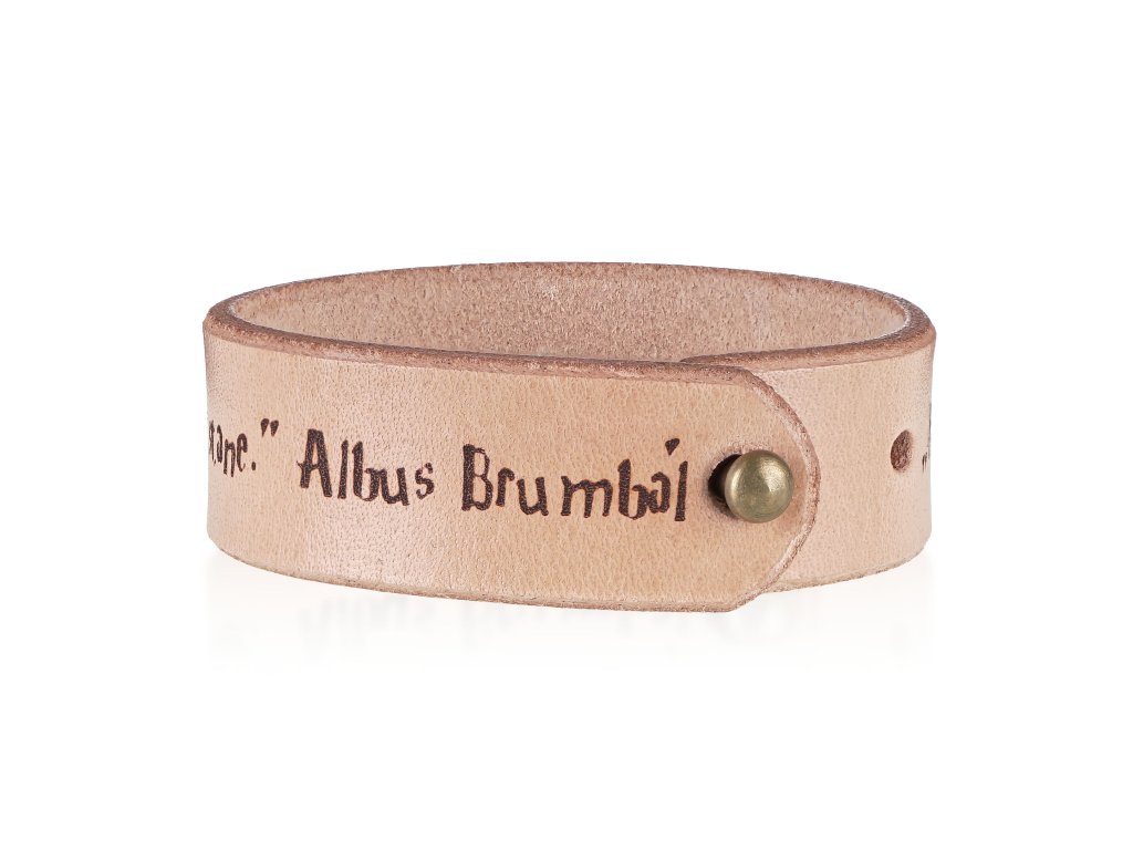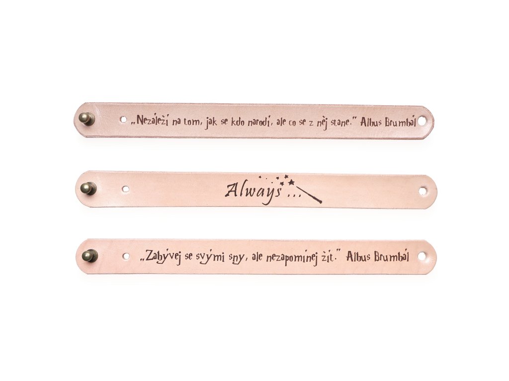 Jedinečný náramek s citáty oblíbených postav z příběhů o Harry Potterovi nadchne každého fanouška. Náramek nebyl vykouzlen žádnou kouzelnickou hůlkou, ale byl vyroben hezky ručně v našem brašnářství ze 100% hovězí kůže hrubé cca 2 mm. Nápisy jsou na kůži vygravírovány laserem. Zapínání náramku je vyřešeno pomocí kovového cvočku, který můžete nastavit na dvě délky – 19 cm a 17 cm (obvod zápěstí). Který z citátů ozdobí vaší ruku? 1) Always... 2) Nezáleží na tom, jak se kdo narodí, ale co se z něj stane. Albus Brumbál 3) Zabývej se svými sny, ale nezapomínej žít. Albus Brumbál