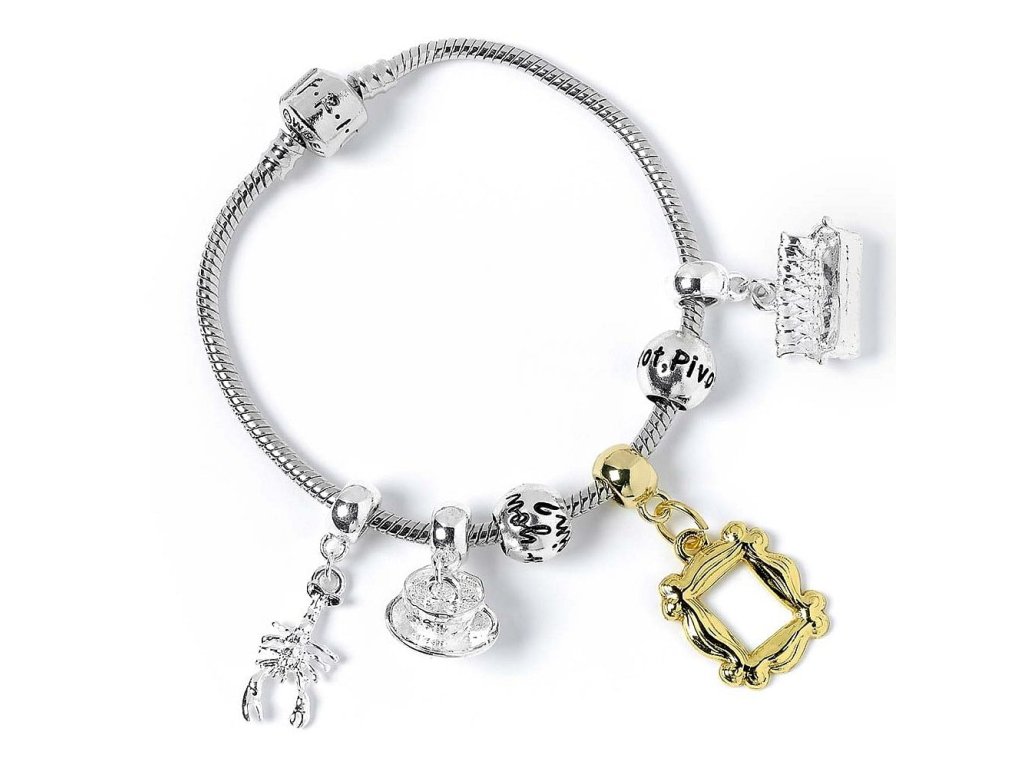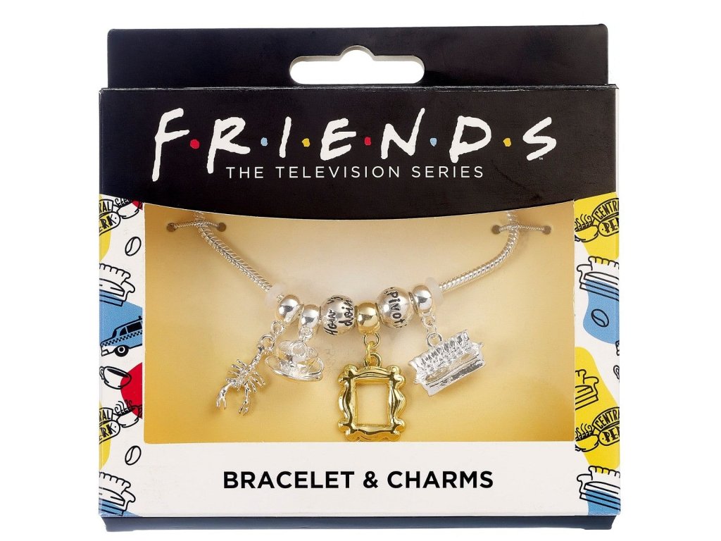 Pěkný kovový náramek pro fanynky seriálu Přátelé - Friends se stylovými přívěsky a korálky. Přívěsky jsou v podobě ikonických symbolů z oblíbeného amerického sitcomu - humr, šálek kávy, rám či pohovka. Náramek je dlouhý 19 cm, přívěsky a korálky jsou postříbřené (jeden přívěsek pozlacený).