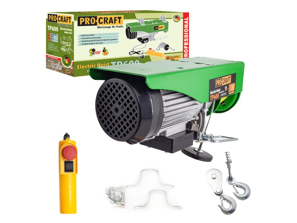 Naviják lanový elektrický Procraft TP600 Součástí balení: 2 úchytky, ocelové lano. Příkon (W) 1200 Maximální nosnost bez kladky/s kladkou (kg) 300/600 Výška zdvihu bez kladky/s kladkou (m) 12/6 Rychlost zdvihu bez kladky/s kladkou (m/min) 10/5