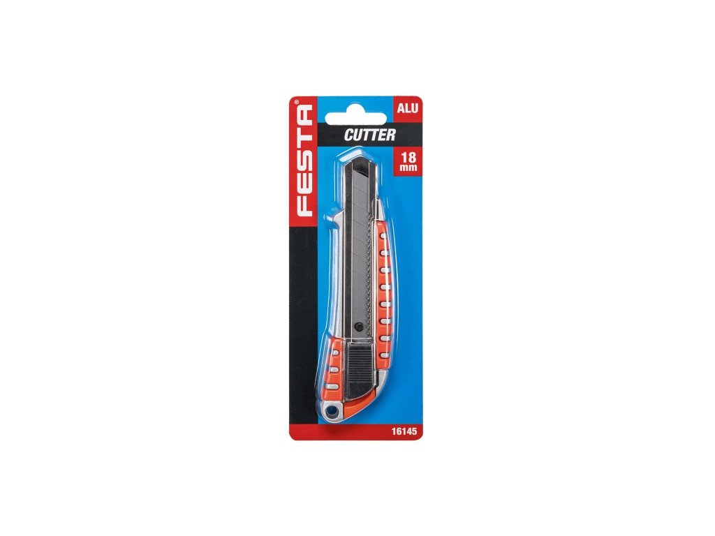 Odlamovací nůž FESTA 18mm, kvalitní materiály, celokovové tělo nože, protiskluzné plastové výstupky, kovová lišta, automatická posuvná aretace, do nože lze umístit až 2 náhradní břity, blistr.