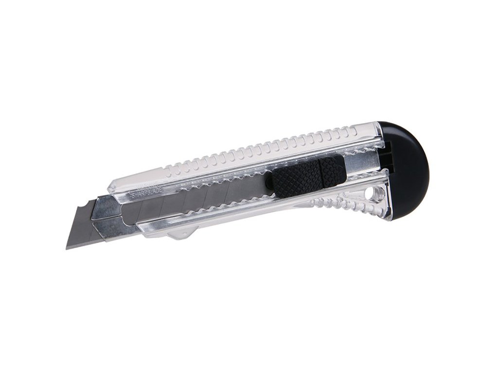 Odlamovací nůž, ocelová vodící lišta, tlačítkový posuv s aretací, 18mm.