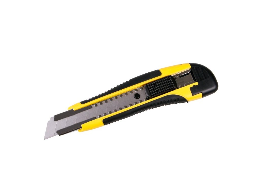 Jedná se o sadu odlamovacích 18 mm nožů. Prodejní box 24 ks. Jedná se o kvalitní odlamovací nože pro 18 mm odlamovací čepele. Ergonomicky tvarovaná rukojeť. Automatická aretace čepele se šroubkovou pojistkou. Kovová lišta. Materiál: kov, plast.