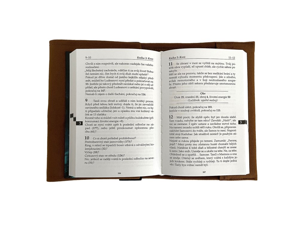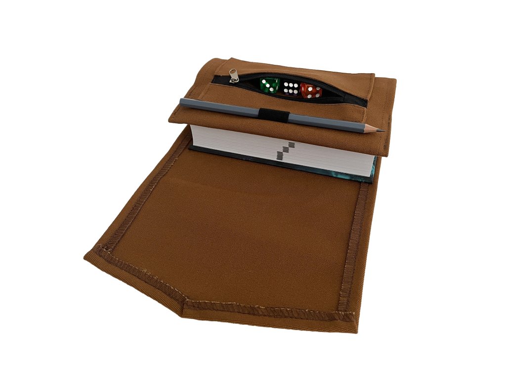 Na výdrž vašeho gamebooku, který s vámi všude cestuje, už házet kostkou nemusíte! Pro toulavé dobrodruhy, jsme ušili speciální obal na gamebook s kapsou na kostky a gumičkou na tužku. Zavinovací látkový obal je ušitý na míru gamebookům z nakladatelství Mytago (kromě Rytíře temného slunce). Výška knihy 16,5 cm, na šířku se obal přizpůsobí. Jde o poctivou ruční práci a originální výrobek z naší dílny, který jinde nenajdete. Obal byl navržen tak, aby spolehlivě chránil knihu před poškozením. Zavírá se jednoduše, přetažením textilní gumy přes zabalený gamebook.