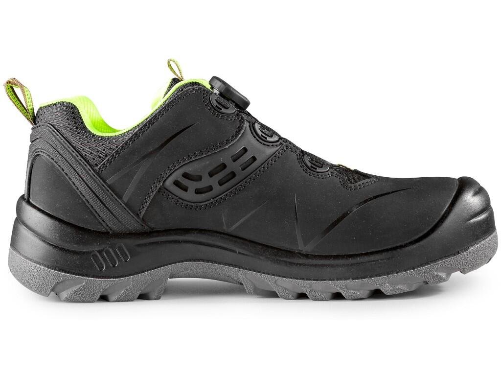 Bezpečnostní kožená polobotka s plastovou špicí a planžetou Dyna-Flex®, reflexní doplňky. Speciální utahovací systém umožňuje rychlé stažení i uvolnění obuvi. Materiál: svršek z 1,6 - 1,8 mm štípenkové nubukové kůže (z jednoho dílu), vnější PU ochran