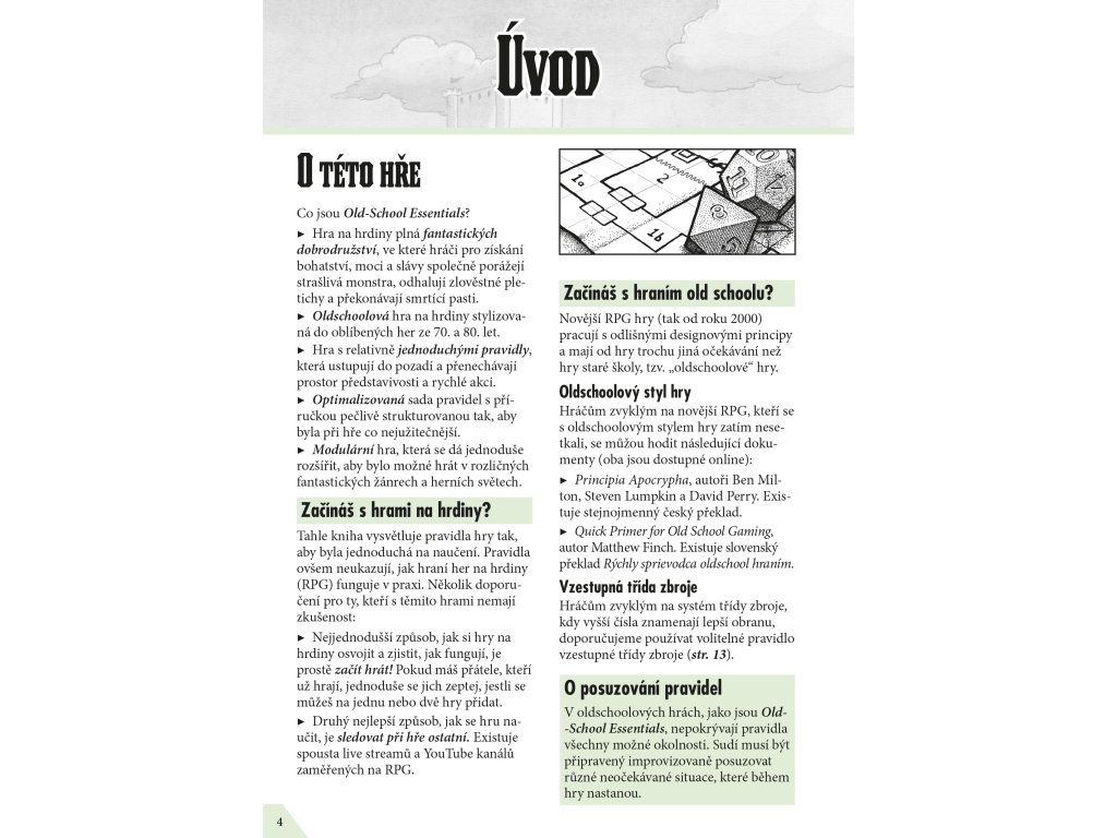 Old-School Essentials (OSE) přináší to nejlepší z klasických her na hrdiny. Jedná se o legendární fantasy RPG, které však zub času neohlodal na kost, nýbrž vybrousil k dokonalosti! OSE vychází z rodiny Dungeons and Dragons - je plně kompatibilní s Basic/Expert verzí D&D z roku 1981. Ano, s onou červenou knížkou, z níž čerpalo při svém vzniku dnes již kultovní Dračí doupě! Příručka reviduje pravidla, upravuje je do lepší čitelnosti a řadí text tak, aby ho bez problémů pochopil i úplný začátečník. Výhodou OSE je obrovské množství doplňků, včetně fascinujících dobrodružstí, které jsou tomuto “old-schoolovému”, avšak stále extrémně oblíbenému RPG k dispozici. Odkazy Recenze na RPG Fórum Rozbor příručky od Gergona