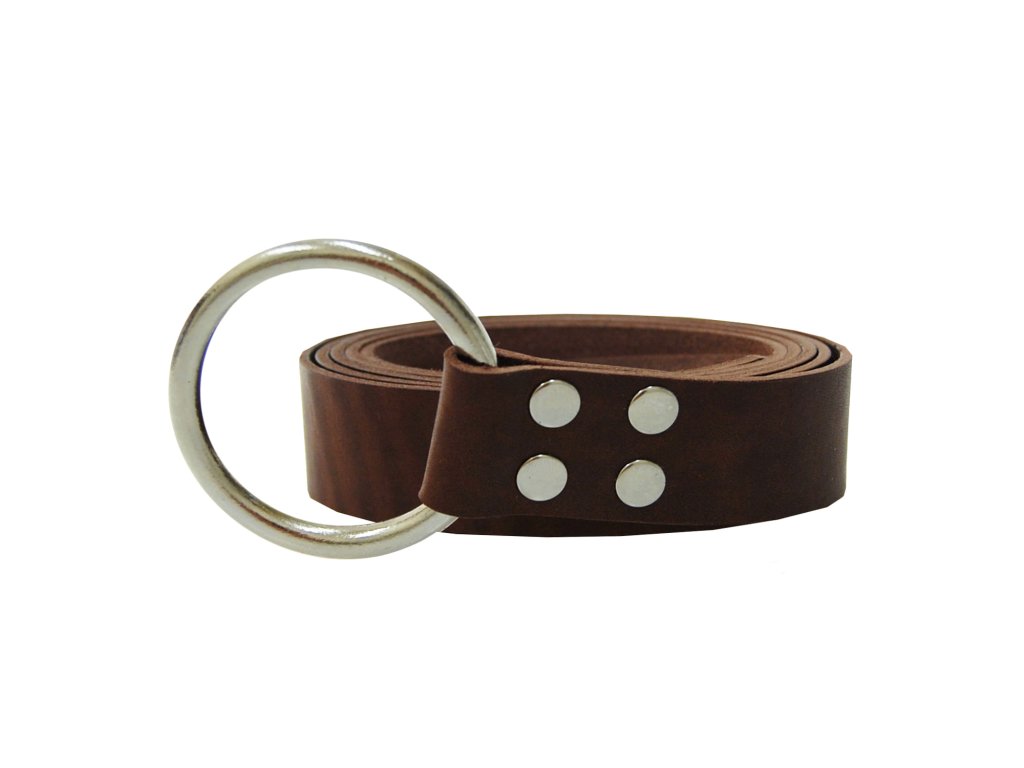 Jednoduchá varianta středověkého provlékacího opasku s kovovým kroužkem - zavazuje se na uzel provlečením skrz kovový kruh.