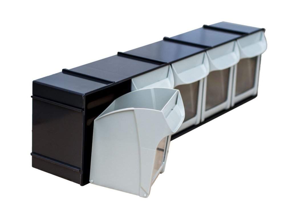 Jeho konstrukce je opatřena drážkami na všech čtyřech stranách, které umožňují skládat více organizérů i různých velikostí dohromady na sebe i vedle sebe a vytvořit si tak variabilní box individuálních rozměrů.
