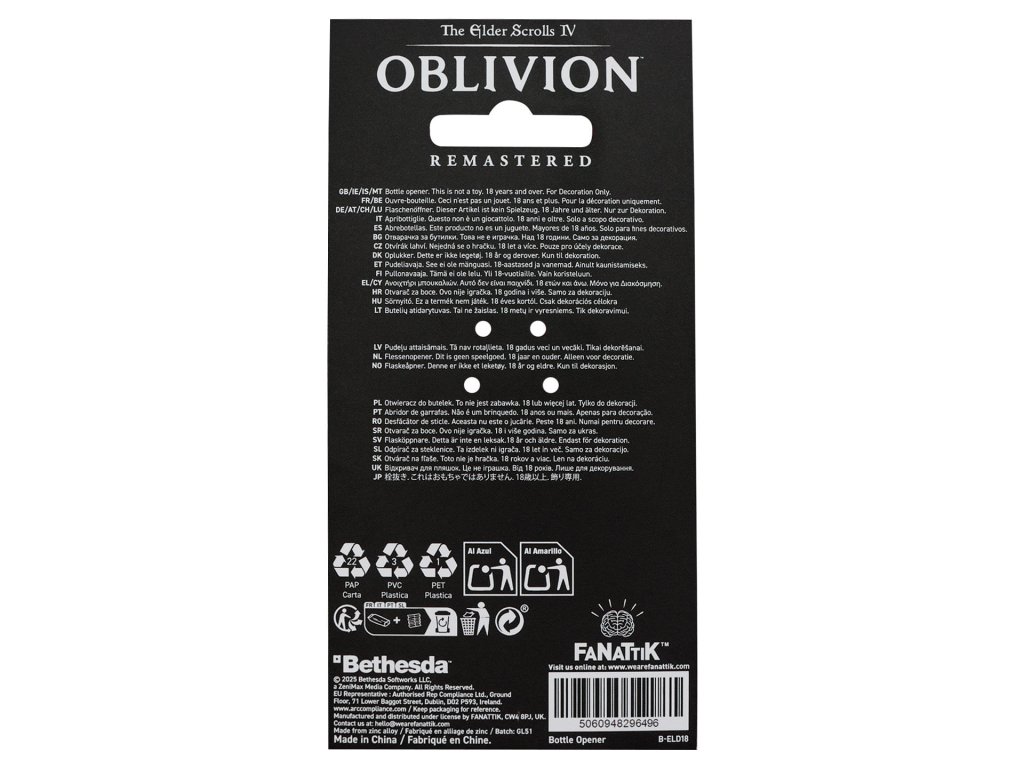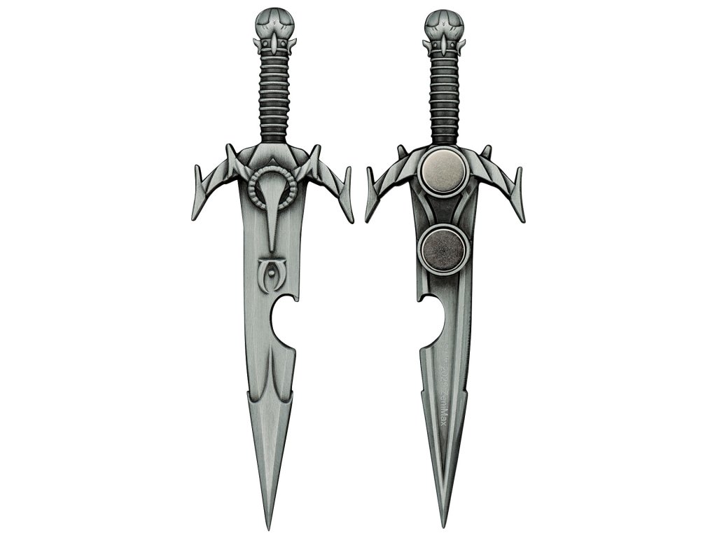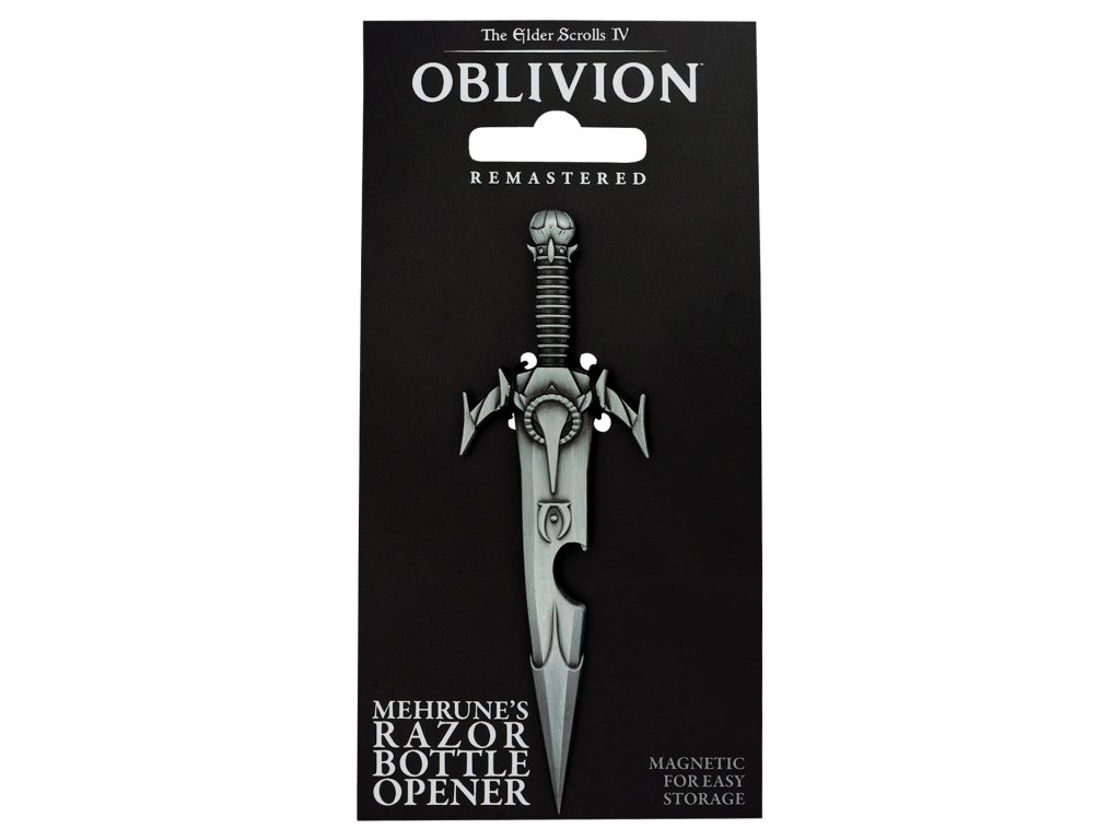 Otvírák The Elder Scrolls IV: Oblivion – Mehrune’s Razor přináší smrtící sílu Daedrického prince na tvůj kuchyňský pult. Tato oficiálně licencovaná kovová replika legendární dýky má rozměry 120 × 40 mm a v čepeli výřez určený pro otevírání lahví. Díky antik niklové povrchové úpravě vypadá jako právě objevený někde ve městě v Tamrielu, zatímco magnetická zadní strana umožňuje přichycení na lednici nebo kovový povrch. Stylový doplněk pro fanoušky série, který je praktický i epický zároveň.