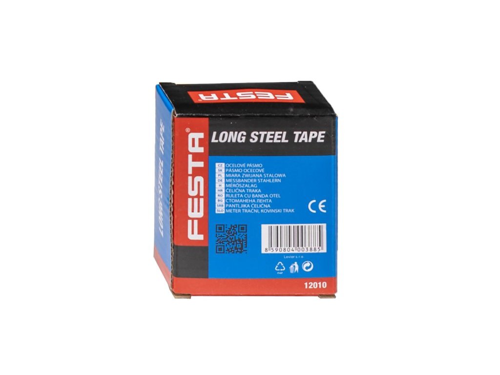Kvalitní a přesné ocelové pásmo, kalená páska s očkem, CE certifikát - vhodné ke kalibraci, sklopná navíjecí ručka, poutko.
