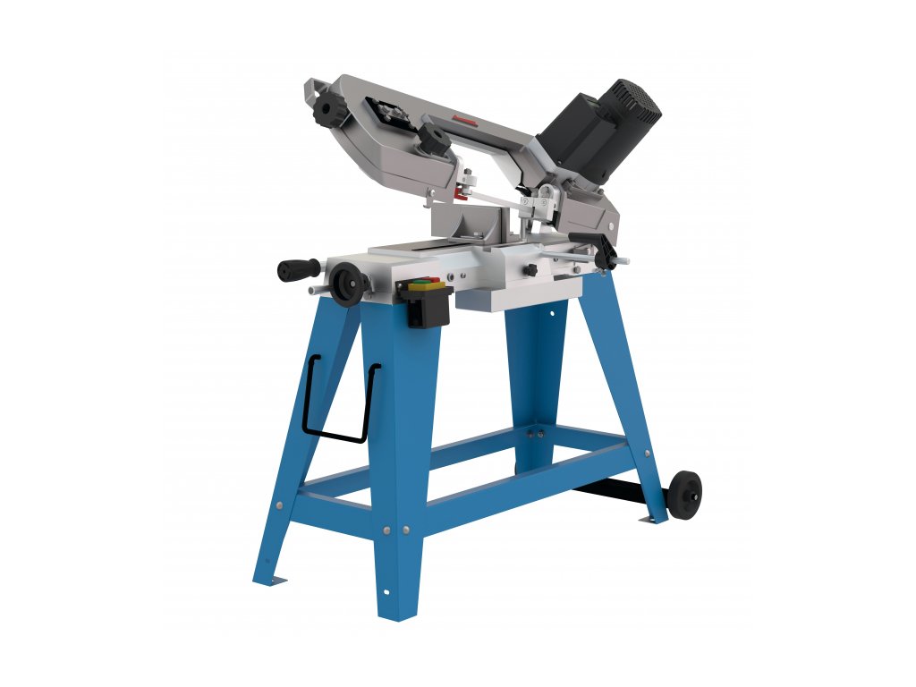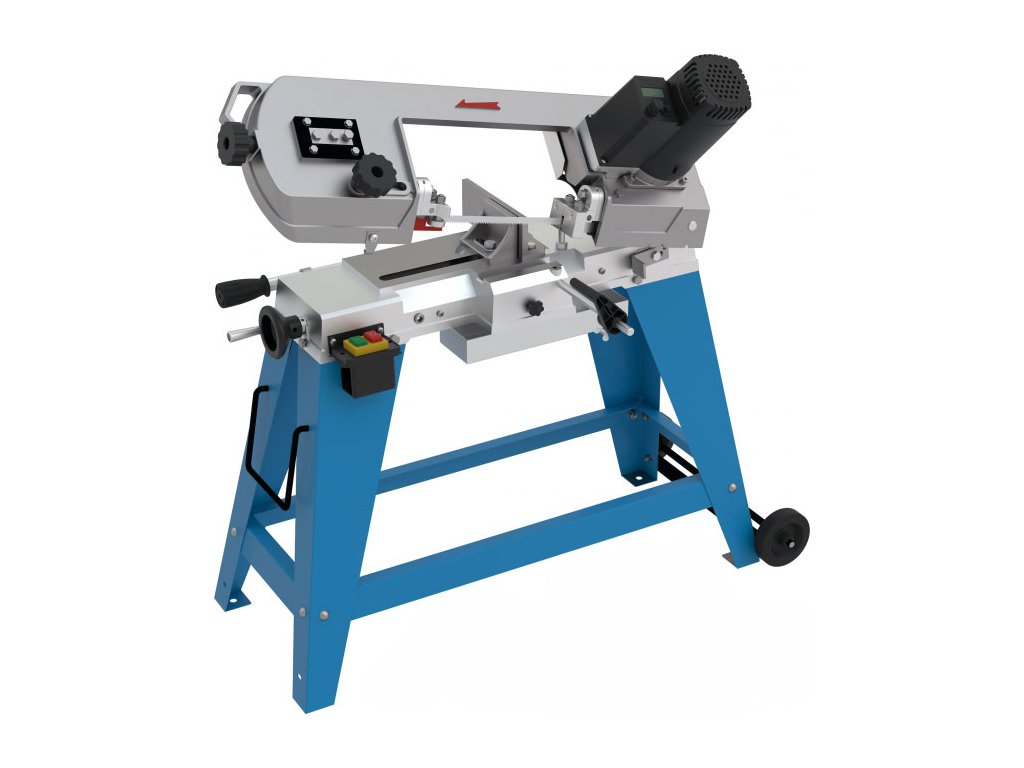 Konstrukce: robustní litinový rám, 3bodové vedení pilového pásu s kuličkovými ložisky, stabilní podstavec s transportními koly na jedné straně a manipulační rukojeť.