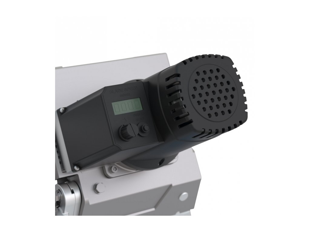 Variabilní posuv pilového pásu; výklopný rám pily k vertikálnímu řezání obrobků na přídavném pracovním stolku.