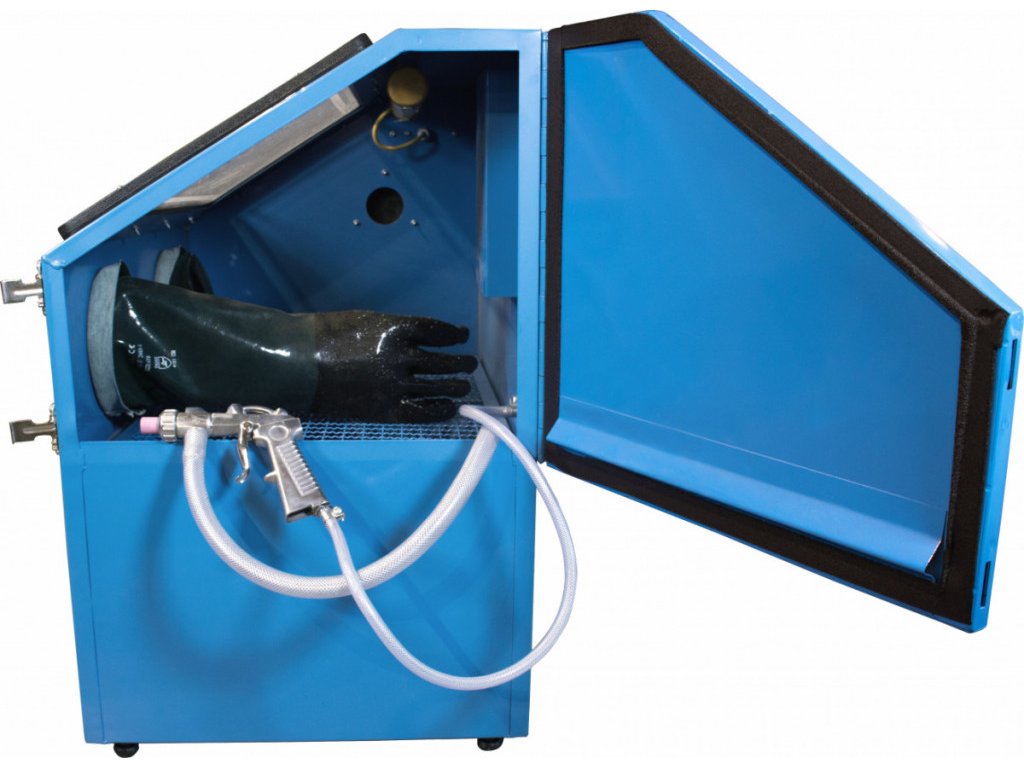 Vícevrstvé průhledové okno; integrované pracovní rukavice; pískovací pistole vč. výměnných trysek (4).
