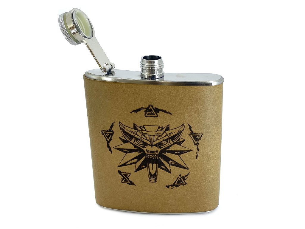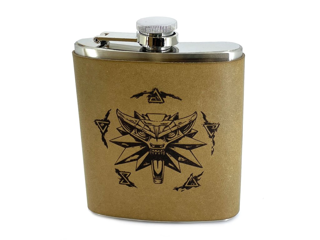 Stylová placatka v koženém obalu s nádherným gravírováním vlčí hlavy a symbolů zaklínačských znamení. Věrný společník na dlouhé večery a neocenitelný pomocník na daleké cesty. Záleží jen na vás, jakým elixírem ji naplníte. Jisté však je, že se s ní blýsknete nejen na LARPu, u táborového ohně, na zaklínačském hradišti, ale také na narozeninové oslavě. Kvalitní placatka z nerezu bezpečně odolá působení živlů. Bez obav s ní můžete vyrazit na dalekou cestu do Cintry nebo na Skellige. Obal jsme pro vás vytvořili v naší dílně z hovězí kůže prvotřídní kvality, kde se dočkal i originálního gravírování. K nerezové placatce dostanete i užitečný nálevkový trychtýřek. Nevyhovuje vám zajkínačská symbolika vlčí hlavy a znamení? Pořiďte si placatku v koženém obalu bez zdobení, na kterou vám gravírováním můžeme vytvořit grafiku na přání. Pokud svoji placatku máte rádi po ruce, připravili jsme pro vás kožené pouzdro na opasek. Stylová placatka v koženém obalu se také hodí jako skvělý dárek. Na přání vám na ni můžeme pomocí gravírování doplnit třeba věnování či jméno obdarovaného.