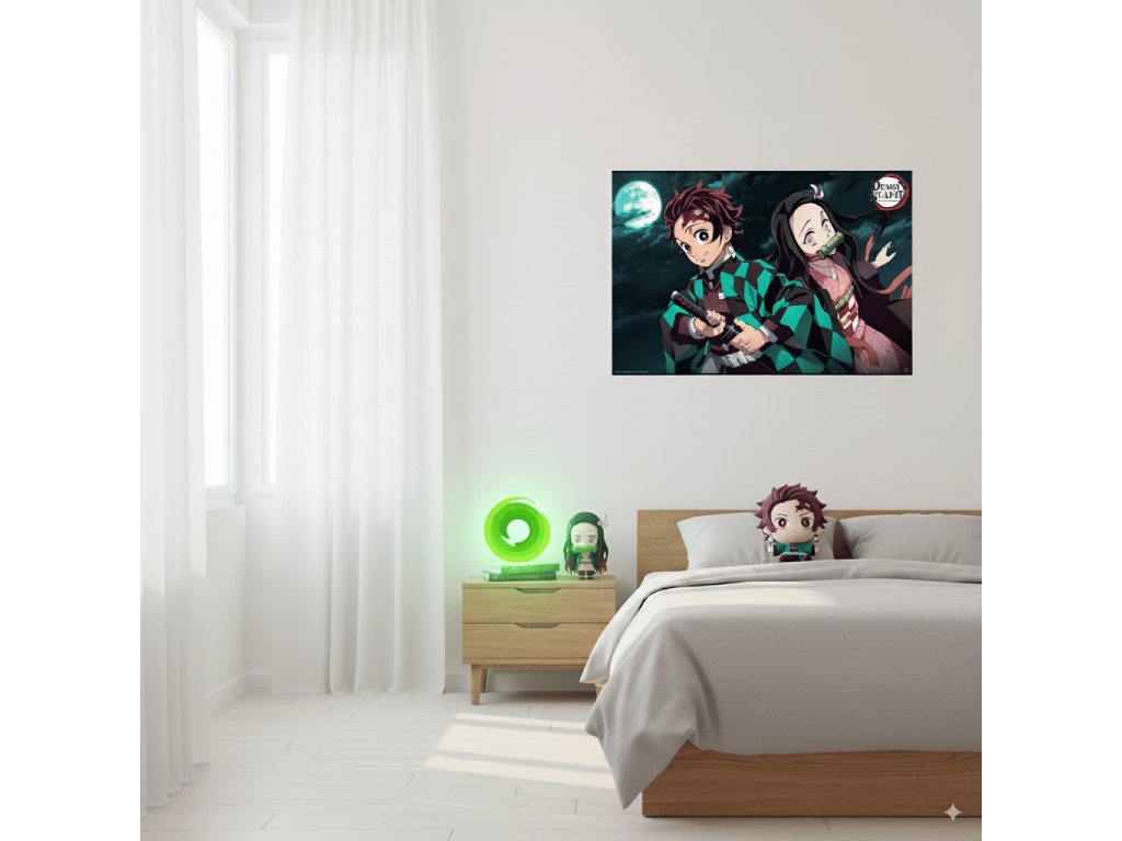 Hezký plakát s grafikou hrdinů dark fantasy mangy Demon Slayer - Tanjira a jeho sestry Nezuko. Skvělý dárek pro fanoušky této japonské série!