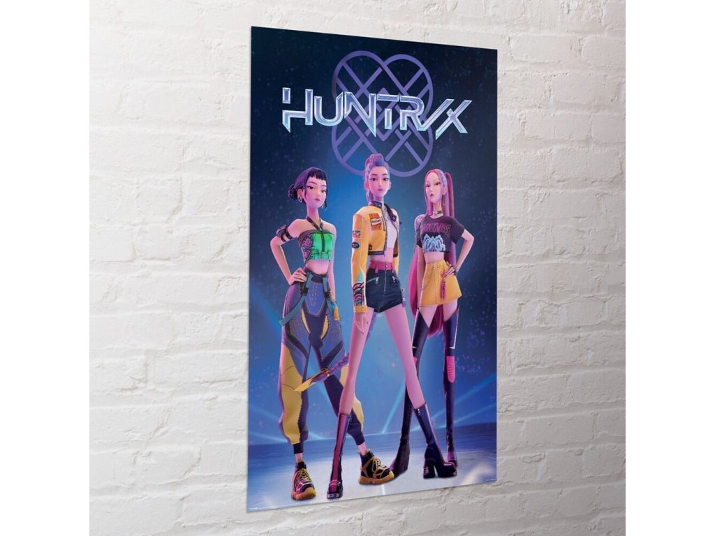 Plakát s trojicí hlavních hrdinek z Huntrix (Rumi, Mira a Zoey) - lovkyní démonů a KPopových zpěvaček z amerického animovaného filmu KPop Demon Hunters (K-pop: Lovkyně démonů) od Netflixu - to je ten pravý nářez pro tvou hernu nebo domácnost! Pověs si na stěnu tři jedinečné divy a vládkyně nejen koncertního pódia.