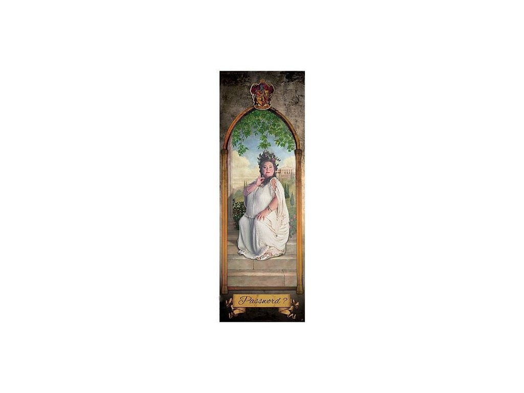 Plakát vhodný na dveře s Tlustou dámou z příběhů o Harry Potterovi od J. K. Rowlingové. Znáte tajné heslo pro vstup do Nebelvírské věže?