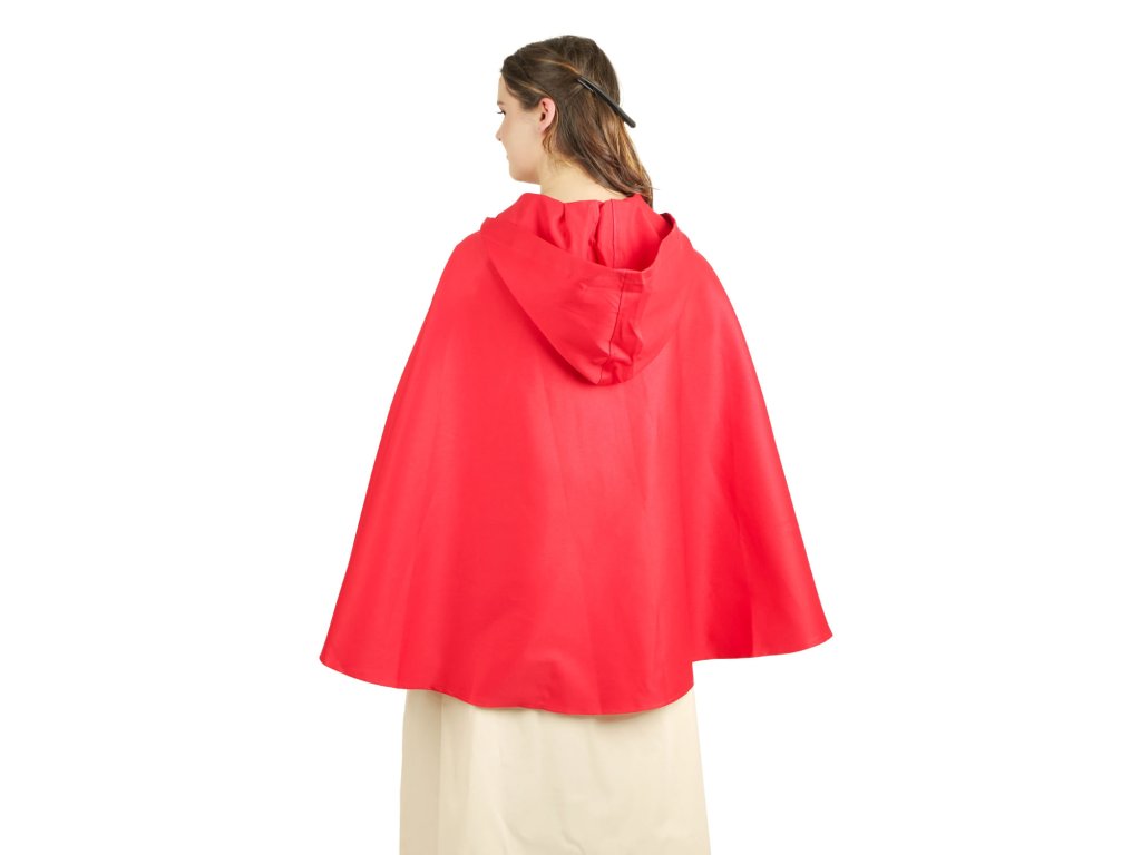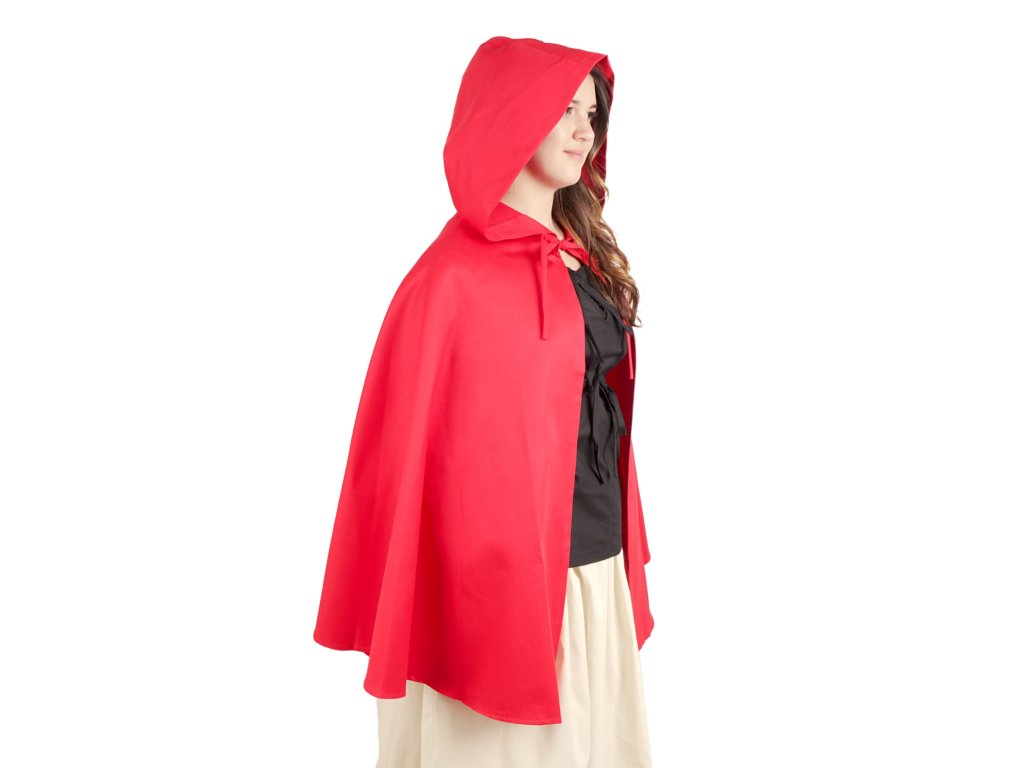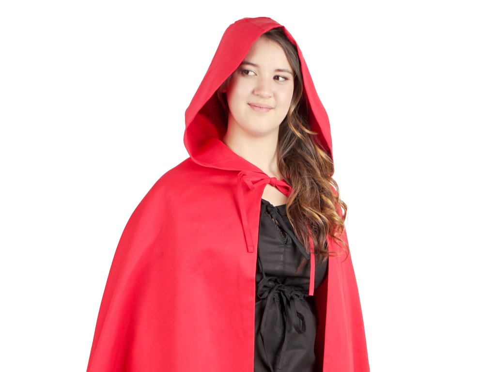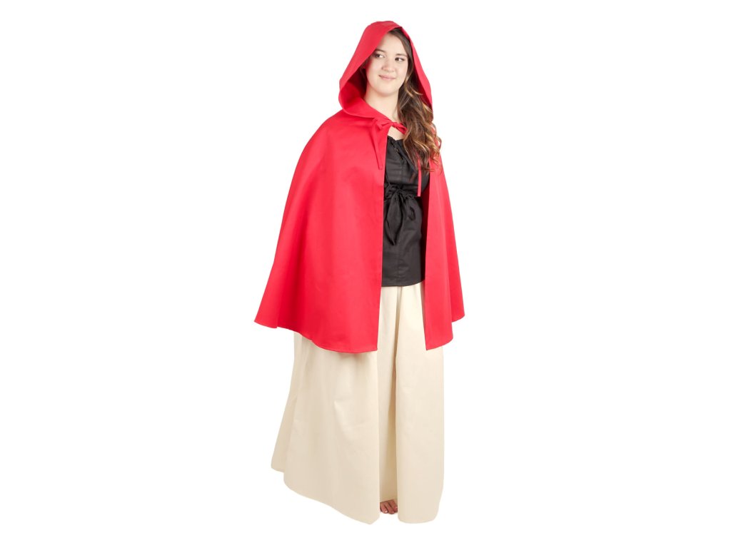 Kratší verze pláště půlkolového střihu se slušivou kapucí. Červený plášť je vyrobený z pevné bavlněné látky. Zavazuje se šňůrkou pod krkem. Stylový plášť se hodí především na cestu přes les k babičce. Můžete ho ale využít třeba na maškarní ples nebo LARP. Večer se pak do něj můžete zabalit a pomůže vás ochránit před chladem. Kratší plášť pak oceníte zejména v boji, kdy se vám nebude plést pod nohy. Dotáhněte svůj kostým k dokonalosti některou z plášťových spon z naší nabídky. Nebo omrkněte náš výběr stylových fantasy šperků. Délka pláště měřena od krku na zadním díle: S: 70 cm, M: 80 cm, L: 90 cm, XL: 100 cm.