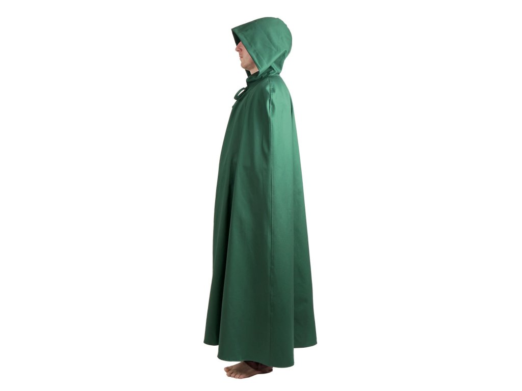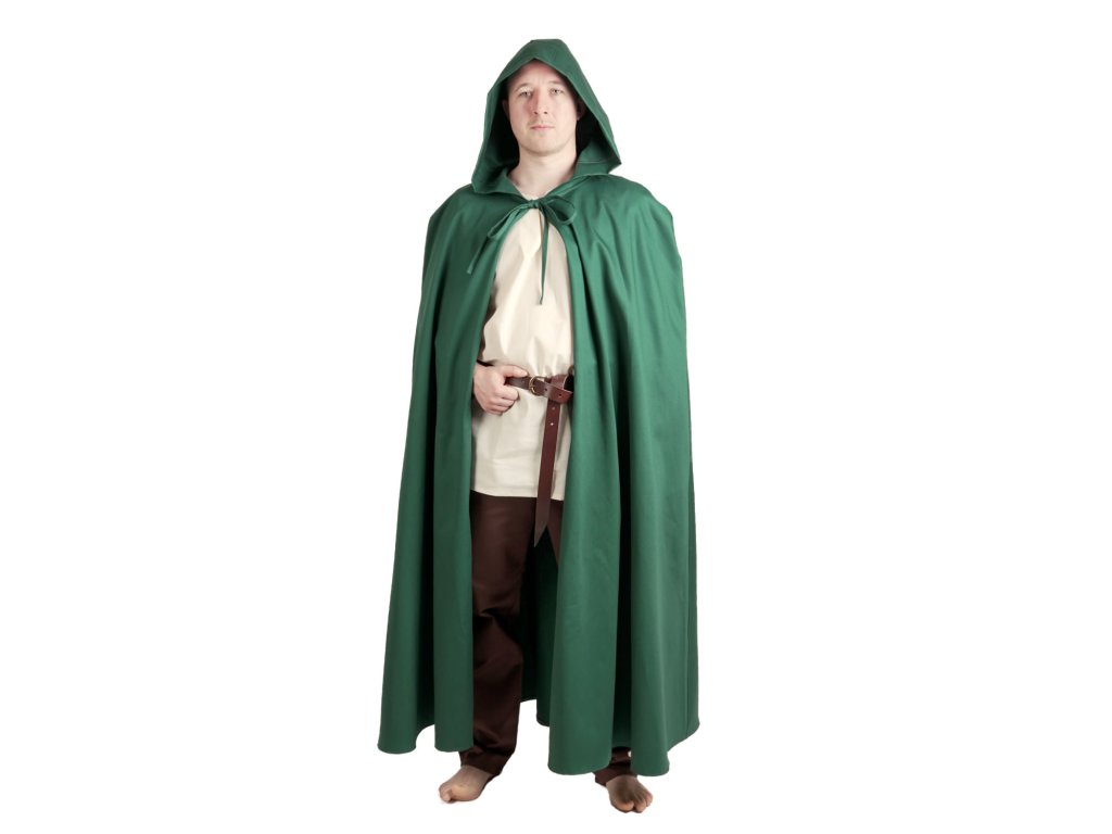 Hraničář nese důležitou zprávu čarodejnici čekající ve své chýši hluboko ve starém hvozdu. Obratně se pohybuje po stezkách lesní zvěře a nepolevuje v chůzi, ať už je počasí, jaké chce. Ještěže mu naše zručné švadlenky ušily tmavě zelený plášť s kapucí, který mu nebrání v pohybu a zároveň jej chrání před větrem i lehčím deštěm. Tmavě zelený keprový plášť Hraničář s širokou kapucí, která vrhá stín dávných časů do tváře, využijete na larpu i na středověkých slavnostech k nejrůznějším historickým a fantasy kostýmům. Délka zad: S: 103 cm, M: 119 cm, L: 133 cm, XL: 147 cm Tento plášť šijeme i v dalších barvách: černý, hnědý a světle zelený.