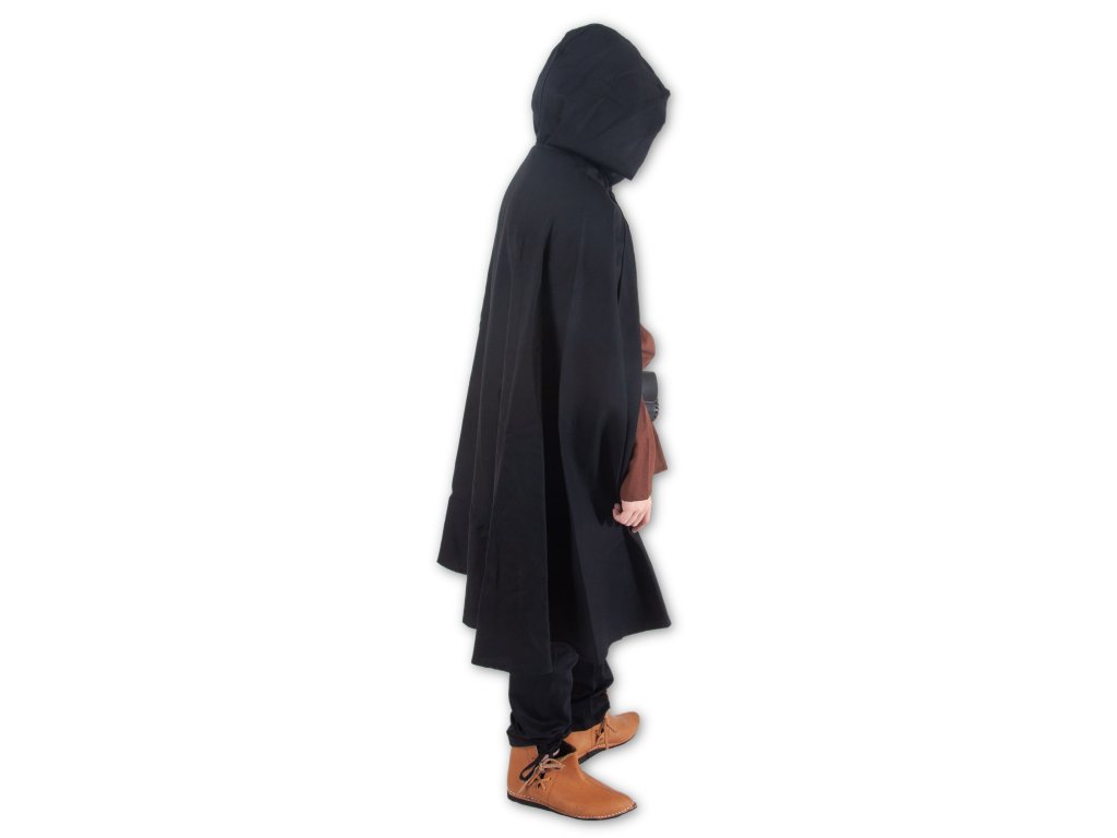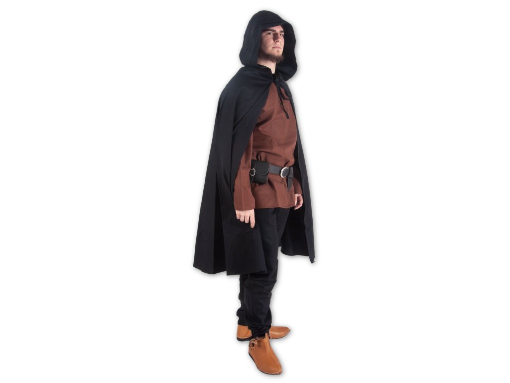 Náš jednoduchý plášť má základní půlkolový střih, je ušit z pevné bavlněné látky a pod krkem se zavazuje na šňůrku. Plášť má praktickou kapuci, která vás ochrání před deštěm či větrem. Tento plášť je skvělým doplňkem k takřka každému fantasy kostýmu, hodí se na LARP, dřevárny, divadlo, karneval. Plášť je k mání je ve čtyřech velikostech! Více o použitém materiálu se dočtete zde: popis materiálů. Tento plášť šijeme i v dalších barvách: šedý, hnědý, tmavě zelený a vínový.