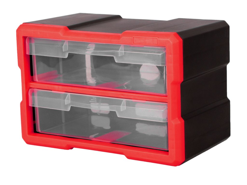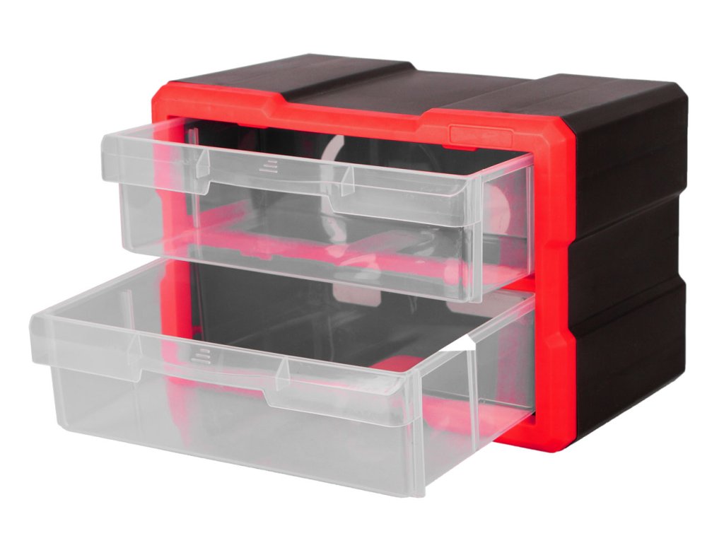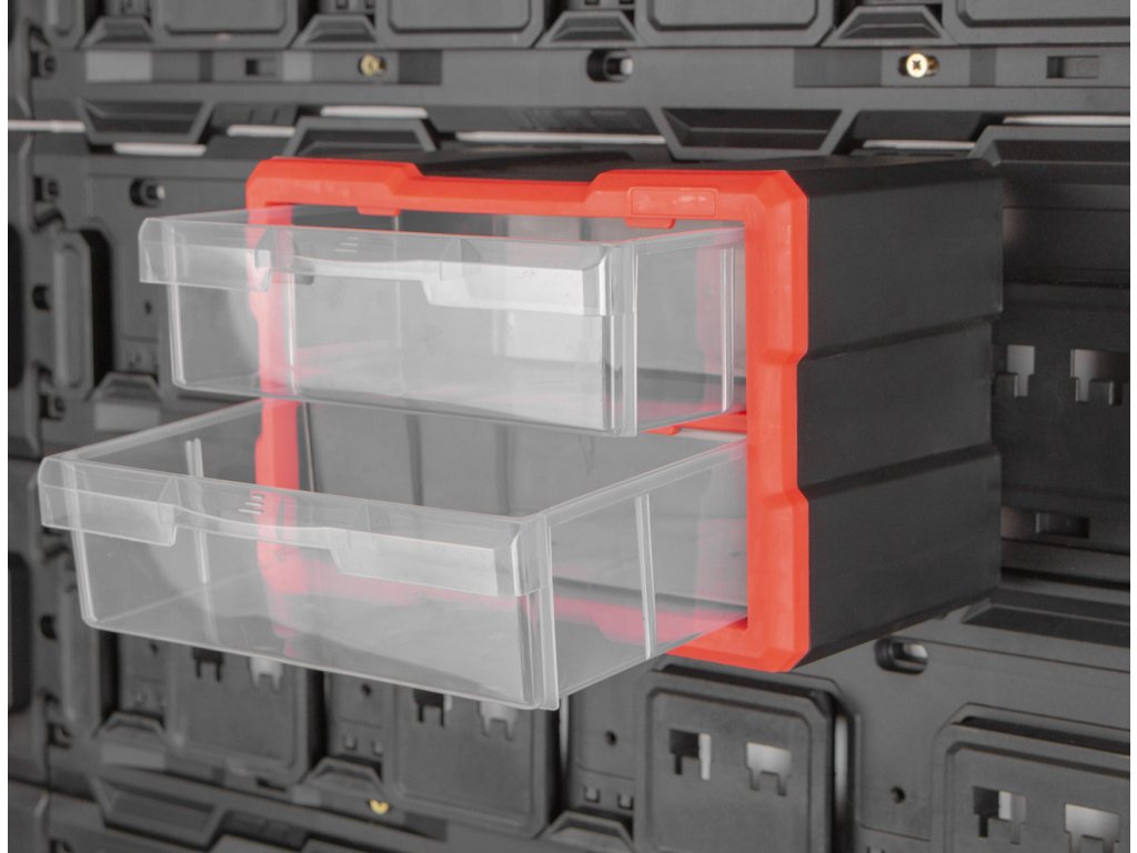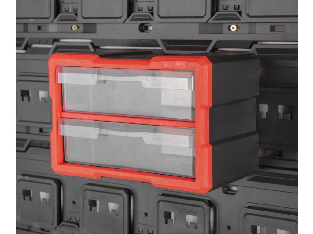 Organizér se 2 zásuvkami k závěsné desce MW7000. Rozměr 29,5 x 19,5 x 16 cm, 2 velké zásuvky. Vysoce odolný plast, červeno-černý, transparentní zásuvky.