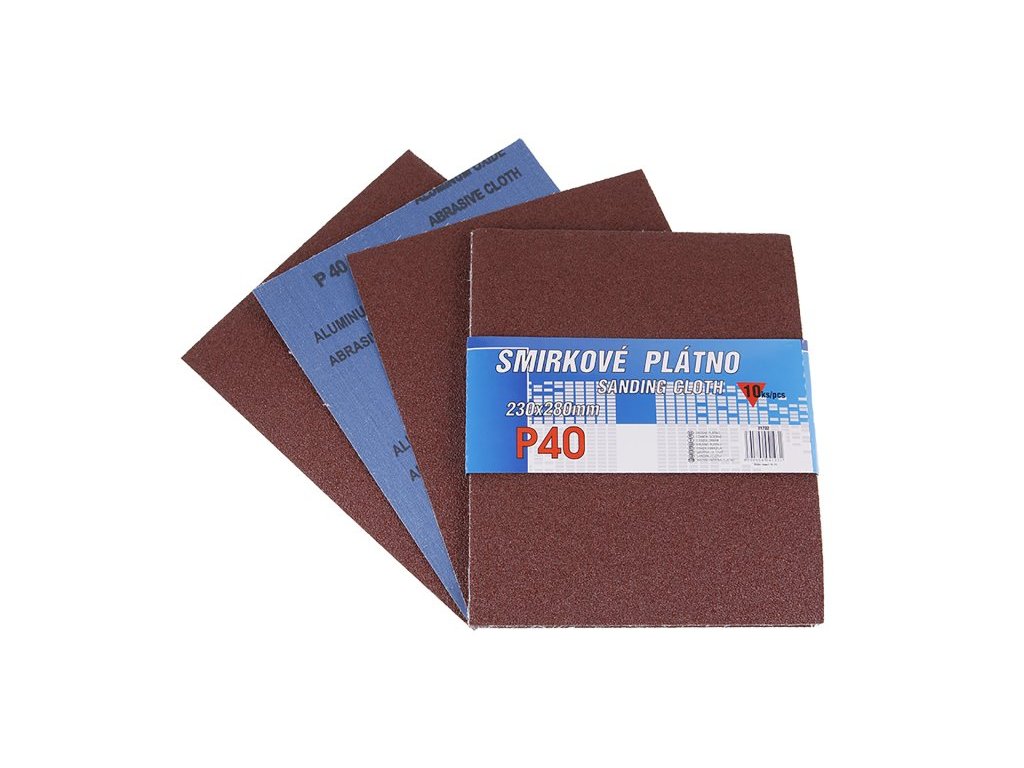Smirkové plátno - sada 10 kusů, zrnitost: 40, druh zrna: oxid hlinitý, pojivo: syntetická pryskyřice, podkladový materiál : pružná tkanina-100% bavlna (240-260g/m2), rozměry : uvedeny v názvu výrobku, balení : 10 kusů - papírový návlek.