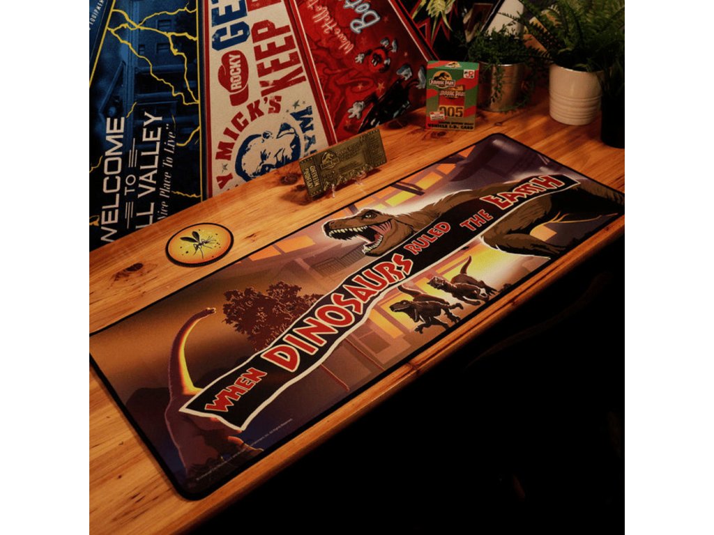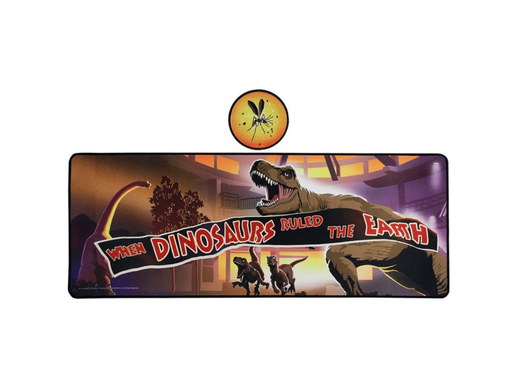 Kvalitní podložka na stůl se hodí k počítači i na hraní deskových her. Promyšlený design podložky vyobrazuje nejoblíbenější dinosaury filmů ze série Jurský park - T-Rexe , brachiosaura a velociraptory. V sadě najdeš také originální podtácek s jantarem a komárem. Podložka má rozměr 80 x 30 cm, podtácek má průměr 10 cm, obojí je z cca 3 mm tlustého neoprénu s protiskluzovým povrchem na spodní straně.